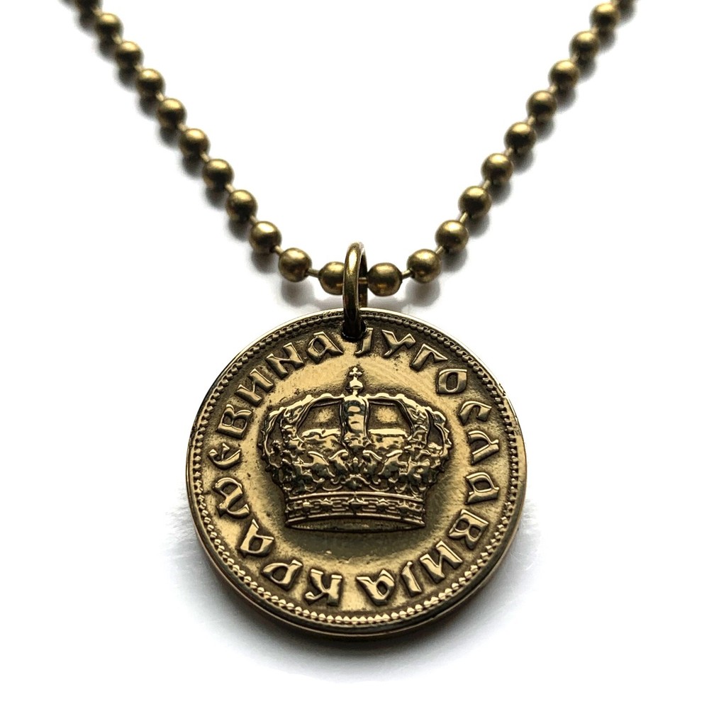 1938 Yugoslavia 1 Dinar {1-year issue} 17S King Petar II FEATURING front: large crown Lettering: КРАЉЕВИНА ЈУГОСЛАВИЈА (Kingdom of Yugoslavia) • quantity 1 • demonetized {no longer in circulation} polished Aluminium-Bronze coin • diameter: 21 mm • weight: 3.5 g • comes with a 24" stainless steel ball chain Yugoslavia Jugoslavija Југославија coin pendant necklace jewelry golden crown Belgrade Serbia Srbija Croatia Macedonia Slovenia Montenegro Bosnia & Herzegovina Kosovo Sarajevo Zagreb Skopje Ljubljana Jajce Vojvodina Podgorica Split Sušak South