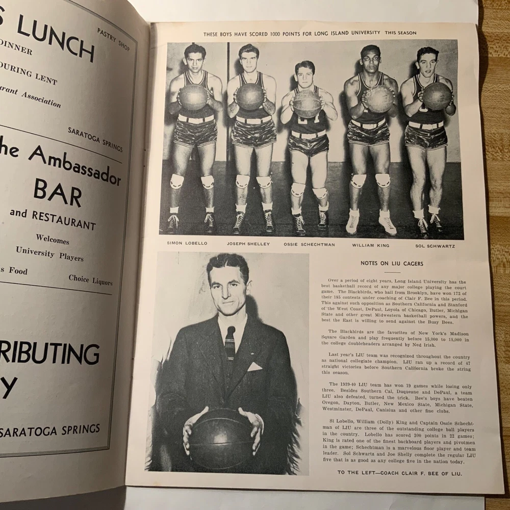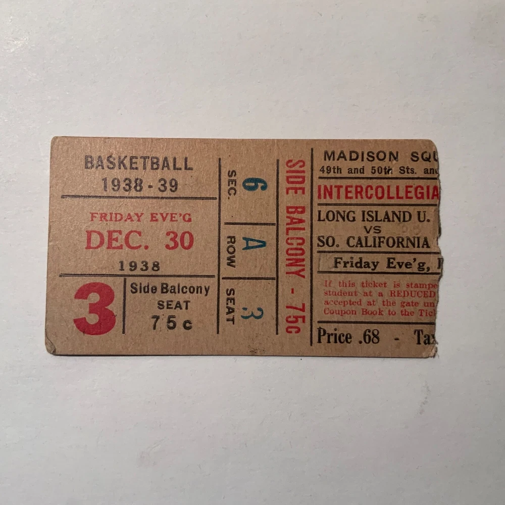 VG - EX. Lot of three items (2 ticket stubs + 1 program) pertaining to Long Island University’s championship basketball run under Hall of Fame coach Clair Bee from 1939 - 1941. The 1938-39 LIU team went undefeated (23 - 0) and then swept through the NIT to become National Champions. The 1939-40 team went 19 - 4 during the regular season, but were defeated by DePaul in the NIT. Finally, in 1940-41 LIU went 25 - 2 and once again swept through the NIT field to claim their second National Championship in three years. The package includes: 1. 12/30/1938 ticket stub - Madison Square Garden - regular season game Long Island U. Vs. USC. 2. 3/2/1940 - Program from double-header at Saratoga Springs, NY - Long Island vs. St. Lawrence / Niagara vs. Sienna. Large 16 page (including covers) program. 3. 1941 NIT ticket stub (unsure of exact date) Eastern Elimination games. Long Island U. Was the eventual champion of the eight team field, which also included Ohio, Seton Hall and CCNY as semi-finalists.