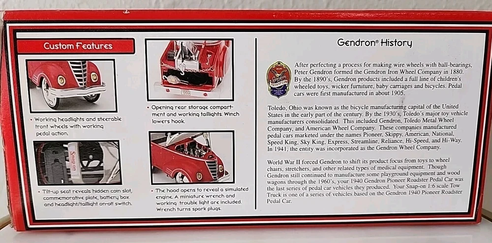 Little to no shelf wear on box. Will combine shipping. AI Description: This is a rare and exclusive 1940 Gendron Tow Truck Pedal Car Bank in 1/6 scale, made by SNAP ON. The diecast model, with a red color and model number 711622002142, is a perfect addition to any car enthusiast's collection. The vehicle make is GENDRON and it is a car model suitable for display or play. The model was manufactured in 1999 and belongs to the Cars character family. This item is a must-have for collectors and enthusiasts alike!