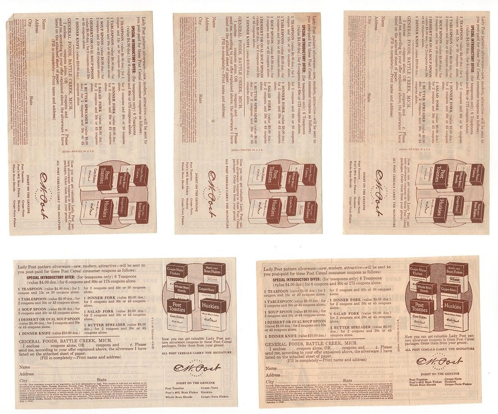 5 Vintage 1940 Post CEREAL Wm Rogers Silverware Advertising Coupon Lady Post 5 Vintage Post Cereal, Wm. Rogers Mfg. Co. Silverware advertising Coupons. Coupons are for "The New Exclusive Lady Post Pattern". Last date to use the coupons is August, 1940. 4 1/2" x 3". All have been folded in the same spot, so probably the way they came in the box of cereal. Nice clean condition. My listings will show up to 3 business days for shipping. This will actually only apply to any package that will not fit in my mailbox, these packages will be shipped 1-2 days. The 3 business days applies to packages that need to be picked up by the Post Office. Thank you for your patience. Satisfaction Guaranteed. Return in original Packaging within 30 days for full refund. Please notify me that an item is being returned. Powered by SixBit's eCommerce Solution