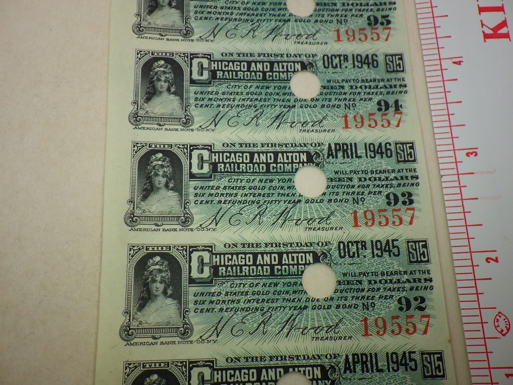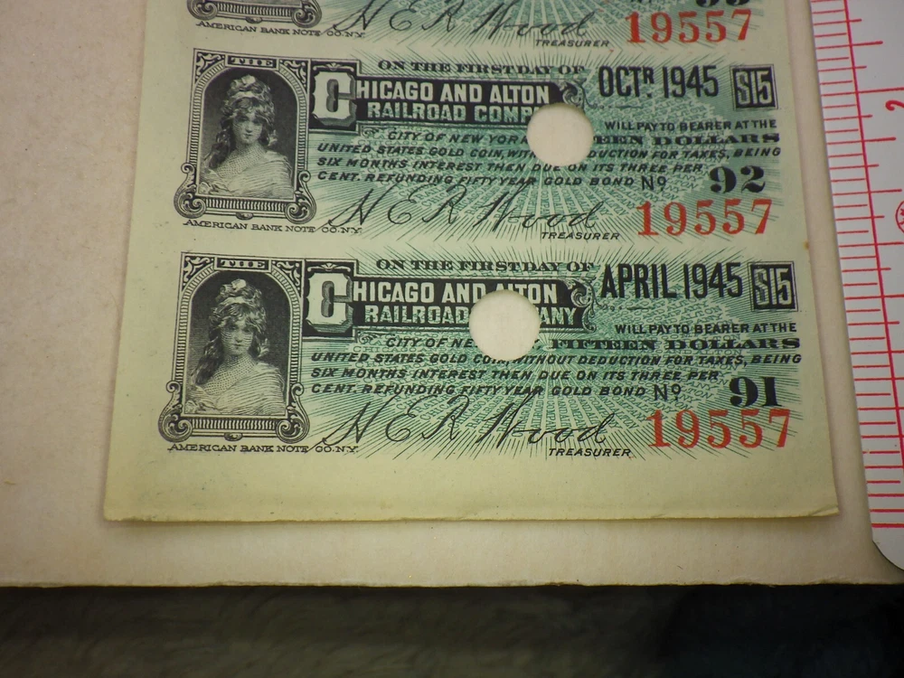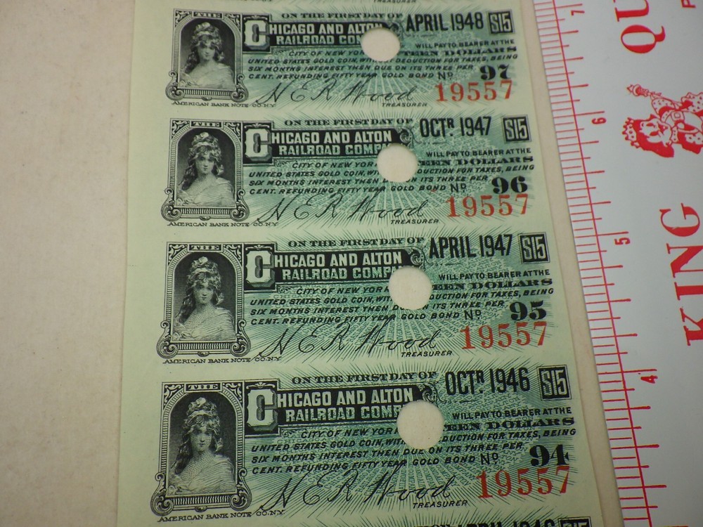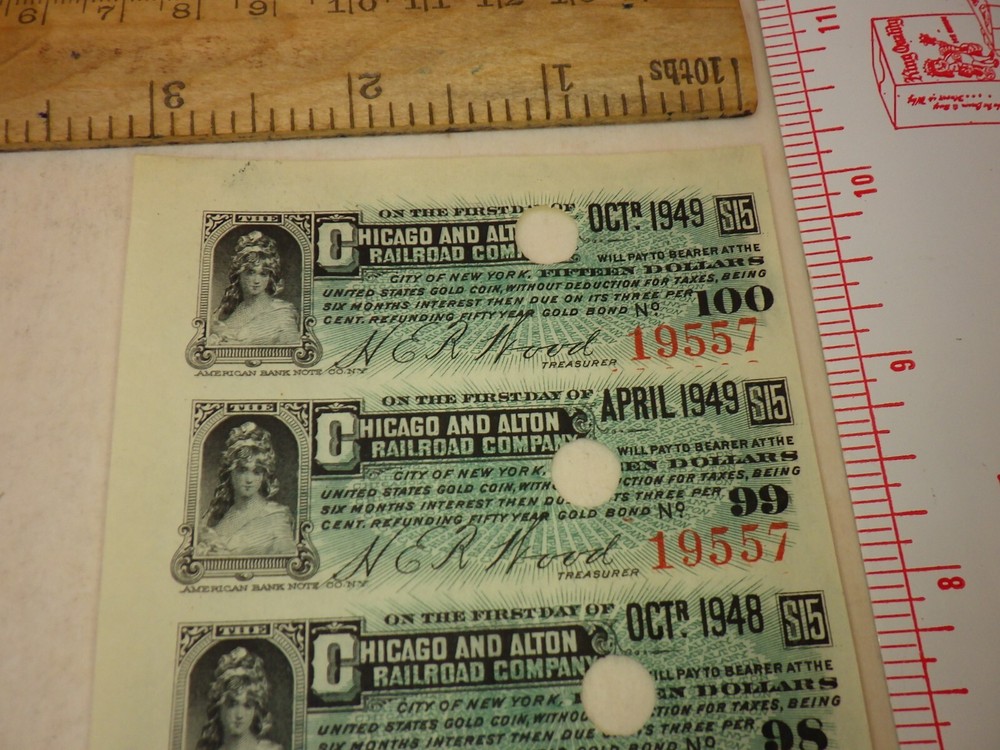 1940s Chicago Alton Railroad Train Company Coupon Bond Stock Vintage Shipped Flat, Poly sealed, and with a backing such as cardstock, cardboard, or similar, to help prevent bending. Ruler(s) not included in the sale. *Please see the photos for the condition and more details. Writing on item packages such as pricing or condition is most likely old and out of date, so please ignore it. Does not include the photo board used to take photos of coins, you get just the coins. *Any weights or measurements are approximate -Shipping for this item will not automatically combine with other items, but we will refund it back to you when applicable.