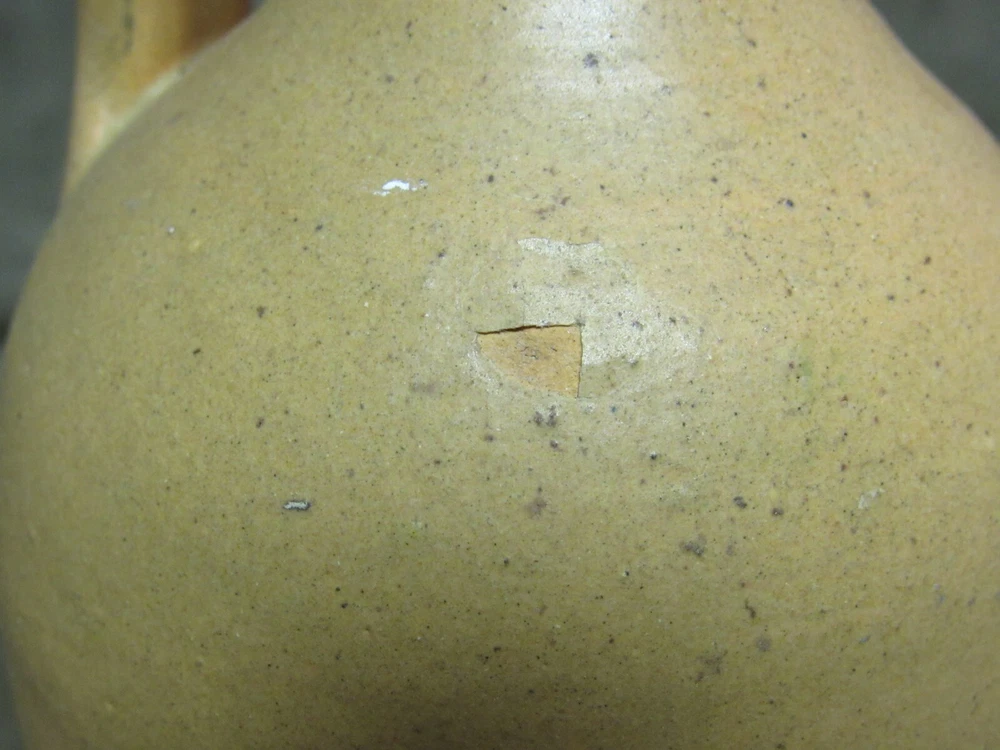 This measures 9-1/2" tall and is 3-1/2" wide, it has a few issues, so please note the damages. This has a chip at the base, see photos, it is approx. 1/2" long. There are some flakes at the spout edge, see photos and a glaze pop on the side, see photo.