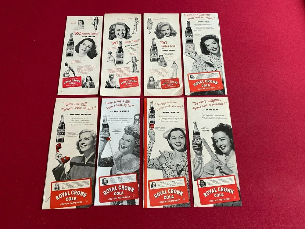 1940's , ROYAL CROWN ( RC ) COLA, (8) Different Magazine Advertisements featuring Legendary Hollywood Actresses, Scarce . Nice Condition. Very Cool RC Cola Collectibles!! Featuring: LAUREN BACALL BETTY GRABLE HEDY LAMARR LORETTA YOUNG SONJA HENIE MARJORIE REYNOLDS MARIA MONTEZ LYNN BARI