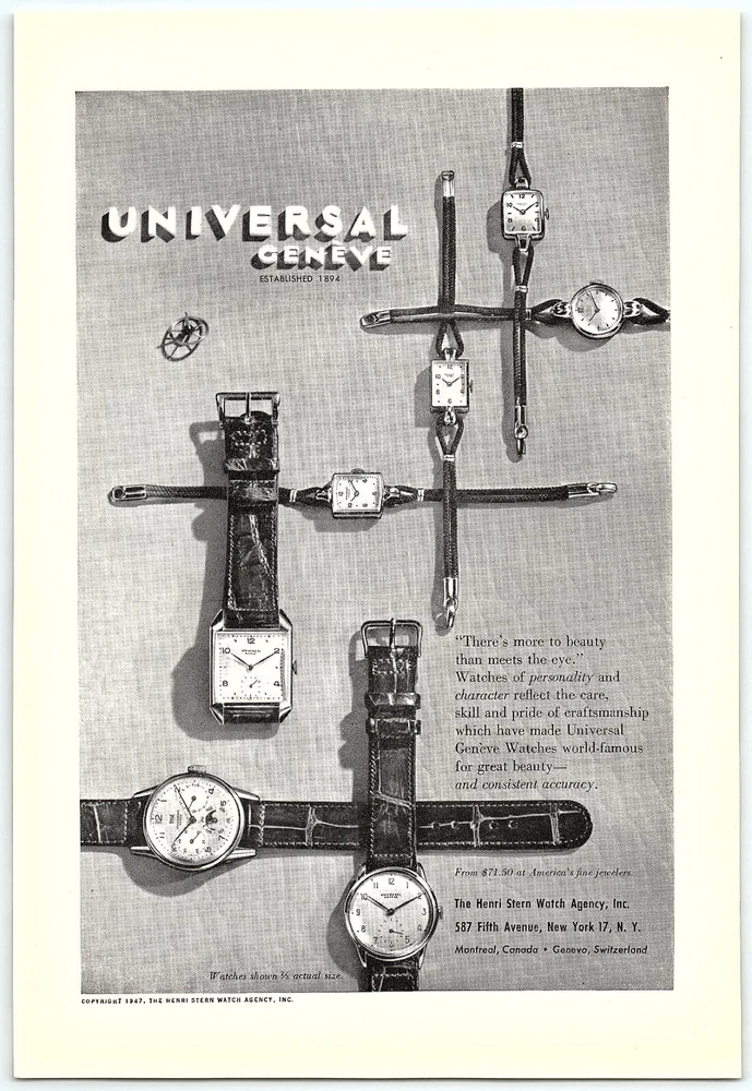 1940s UNIVERSAL GENEVE WATCHES HENRI STERN WATCH AGENCY FULL PAGE PRINT AD Z5273. OVERALL EXCELLENT CONDITION. MEASURES APPROXIMATELY 6 3/4 X 10 INCHES. ALSO HAS A GREAT FULL PAGE AD FOR BELL & HOWARD MOTION PICTURE CAMERAS ON THE REVERSE. Here for your consideration is a great vintage item! Please see the images of the actual item for the best idea of condition. Be sure to check out all of the other great items that we have HERE!