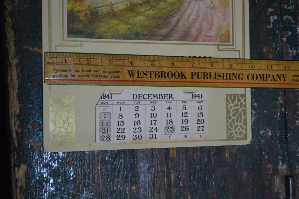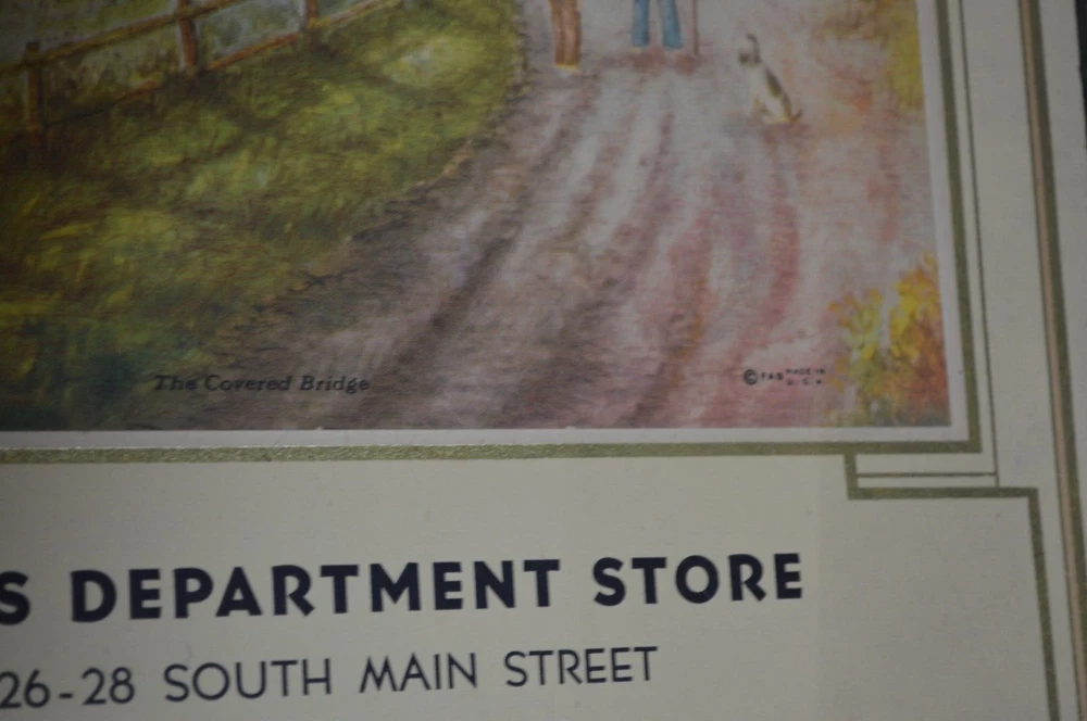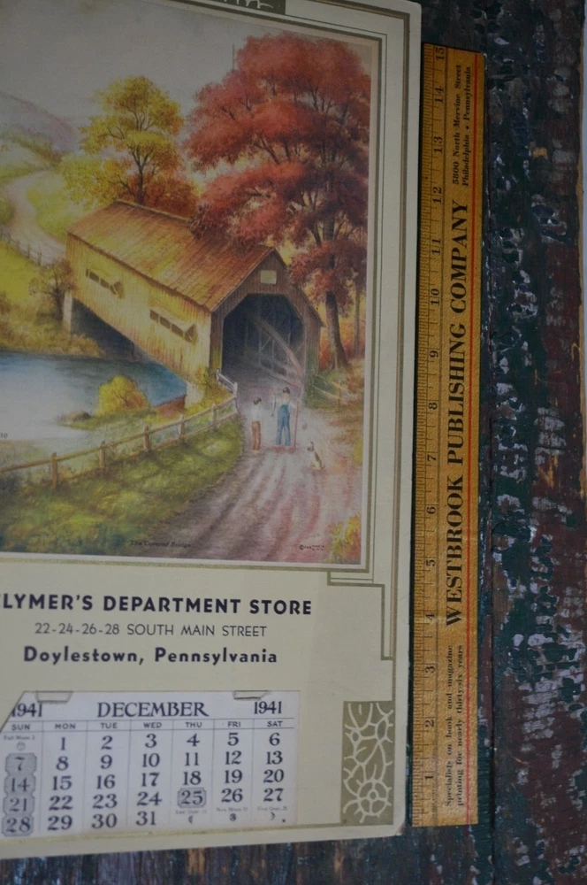 Description:1941 Clymer's Department Store Doylestown Bucks County PA Advertising Calendar Showing Covered Bridge. Age and use related wear noted, but calendar displays well. Only the calendar page for the month of December is present. This calendar calendar would look great matted and framed. Questions and offers welcome. Please review entire listing (including condition, title, pictures, description, and terms) before committing to purchase this listing. Before agreeing to purchase this listing, make your own determination on condition of the item(s) being offered in this listing. Pictures are part of the description and are provided to help illustrate condition. Since descriptions and opinions of condition can vary, seller provides prospective buyers with the ability to request more information and additional pictures before the close of this listing. When in doubt, please contact Taggart Neveling Books Ephemera, LLC "the seller" through eBay before you bid or agree to purchase this listing. This helps ensure a smooth transaction, one where Taggart Neveling Books Ephemera, LLC gets a sale and the buyer gets the item(s) they want to purchase. Condition & Disclosure of All Faults: All items appearing in this listing are pre-owned and are sold "AS-IS" and "WITH ALL FAULTS." No warranties, express or implied, are made in connection with this listing. Additionally, all other warranties not specifically listed above, are also disclaimed. Since the seller, Taggart Neveling Books Ephemera, LLC, does not provide any warranties with this listing, to the fullest extent allowed by law no sale shall be deemed invalid. A written description and uploaded pictures are offered to help provide a general idea of condition. Pictures are part of the description, but may not show every defect or flaw of an item or collection of items. The written description offered in this listing may not state every single defect or flaw in condition associated with item or items offered in this listing. However, Taggart Neveling Books Ephemera, LLC "the seller" offers potential buyers the ability to submit questions before agreeing to purchase this listing. Buyer agrees that a failure to exercise this option is not sufficient cause to initiate a return. Since Taggart Neveling Books Ephemera, LLC offers potential buyers the ability to submit questions before agreeing to purchase this listing, by bidding or agreeing to purchase this listing, buyer agrees seller has provided sufficient legal disclosure of all defects and faults, even if such defects and faults are not specifically identified in the written description or shown in the uploaded images. All statements and descriptions about age, authenticity, condition, fitness for a particular purpose, or origin of items offered in this listing, as well as those made in response to questions about this listing, reflect the opinion of the seller and are NOT offered as statements of fact. By bidding or agreeing to purchase this listing, the buyer agrees that to the fullest extent allowed by applicable law, Taggart Neveling Books Ephemera, LLC "the seller" will not be liable for any defect, error, or omission in this listing. By bidding or agreeing to purchase this listing buyer agrees to have performed all due diligence beforehand. By bidding or agreeing to purchase this listing buyer acknowledges the fact that some or all of the items offered in this listing may require cleaning, conservation, or repair. By bidding or agreeing to purchase this listing, buyer agrees ALL SALES ARE FINAL. NO REFUNDS. NO PARTIAL REFUNDS. NO RETURNS. NO EXCHANGES. Digital Photos and on Screen Viewing: Cameras and computers sometimes display colors differently. Colors, when viewed on a computer screen, can be lighter or darker than the actual item(s) that is being photographed. Please keep this in mind when you place your bid. Please also note: No display props or materials (tape measures, stands, or other items that may be used to help display a listing) are included. Taggart Neveling Books Ephemera, LLC welcomes questions, but asks all potential buyers to submit questions at least one day before the close of this listing. This helps ensure there will be enough time to respond to questions before the close of the listing. Payment Policy: Payment is due within two days of the close of a listing. If a listing remains unpaid for three or more days the issue will be reported to eBay. Failure to pay for an item in a timely fashion may result in a buyer being blocked from both current and future listings offered under this user ID. Sales Tax, Use Tax, Other Taxes: Since tax laws vary by state, you may be responsible for remitting sales or use tax to the appropriate state agency. The bidder, by bidding, agrees that if any sales or use tax (or any other tax) is due on the item(s) purchased, it is to be paid and remitted to the appropriate agency by the buyer and not the seller. Please note that eBay has largely automated this process. However, if there is any error in eBay's collection or the calculation of tax due, the buyer agrees, to the fullest extent allowed by law, to pay the correct amount to the appropriate agency and to not hold the seller responsible for covering any additional amount of tax due. Shipping Policy: Shipping Cost for this listing (Within Continental US): Item will ship for $9.99, with tracking, to continental US. Please note: No in-person pickups or deliveries are offered with this listing. Delivery for this listing will only be made via USPS mail. In listings without free shipping offered, total shipping cost includes all aspects of shipping, such as packing materials, time to pack the listing(s), time and expense incurred to get the listing(s) to the post office, and lastly postage. Postage is just one aspect of shipping cost. Please keep this in mind if you happen to see an instance where the shipping cost charged was higher than the postage cost. Time to Ship: All orders will s