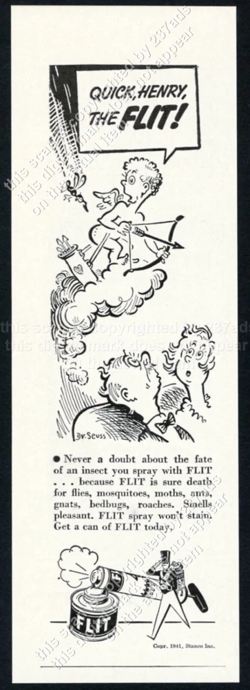 This is an original 1941 print ad for Flit! It measures approximately 8.25" x 2.75" overall, has no tears or stains, comes from a dry, high-altitude, smoke-free environment, and is strictly graded "Near Mint". This vintage ad is not any kind of later reproduction, photocopy or reprint (most ads were published at one time only, and never commercially reproduced). An unusual and distinctive piece for your frame. THANK YOU for the opportunity to earn your business. Thank you for helping us celebrate our 19TH YEAR on ebay! Watch for our special 19% off sales through the year. t237YY 321149 We ship worldwide. We will combine as many items in one package as you want, to save shipping costs. Buy 10 or more items and the shipping is FREE. Use the ebay shopping cart so that there is only one payment, please. We ship six days every week, and if your payment arrives before Noon Mountain Time, your package goes out that same day. Our custom-made shipping tubes (33% thicker than standard USPS/office supply store shipping tubes, and bearing our distinctive cat graphic design!) work perfectly for most items, unless the item is too thick or is of the fold-out type; those will need to be shipped flat. All items which are shipped flat come with a clear sleeve and a nice, substantial backing board, not a cheap flimsy one. Who Buys Our Vintage Ads? Over the past 19 years on ebay, our customers have included museums, galleries, national archives, concert halls, corporate archives, universities, TV and film production companies, private collectors and others in over 100 countries on all seven continents-- yes, including a person stationed in Antarctica. If you've seen print ads used in set decoration for TV shows or films, you've likely seen our ads. If you've looked in major store display windows in New York at Christmastime, you've likely seen our ads. We've been lucky enough to have worked with some of the best in a wide variety of industries, and are looking forward to working with you too. Please let us know if you have any questions prior to purchase. Powered by SixBit's eCommerce Solution