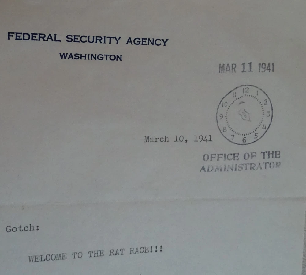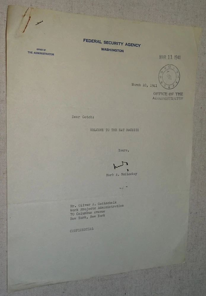 FEDERAL SECRURITY AGENCY - WASHINGTON - MARCH 11 1941 to Oliver A. Gottschalk Code JSB198 Info found online The Reorganization Act of 1939 authorized the President of the United States to devise a plan to reorganize the executive branch of government. Pursuant to the Act, President Franklin D. Roosevelt issued "Reorganization Plan No. 1 of 1939" on April 25, 1939. The reorganization plan was designed to reduce the number of agencies reporting directly to the president. The reorganization plan created the Federal Security Agency. Included in the FSA were the Social Security Board, the U.S. Public Health Service, the Food and Drug Administration, the Civilian Conservation Corps, the Office of Education (later the United States Department of Education), the National Youth Administration and a number of other agencies. Its first director was Paul V. McNutt. Secretly, the FSA was also a cover agency from 1942 to 1944 for the War Research Service, a secret program to develop chemical and biological weapons.