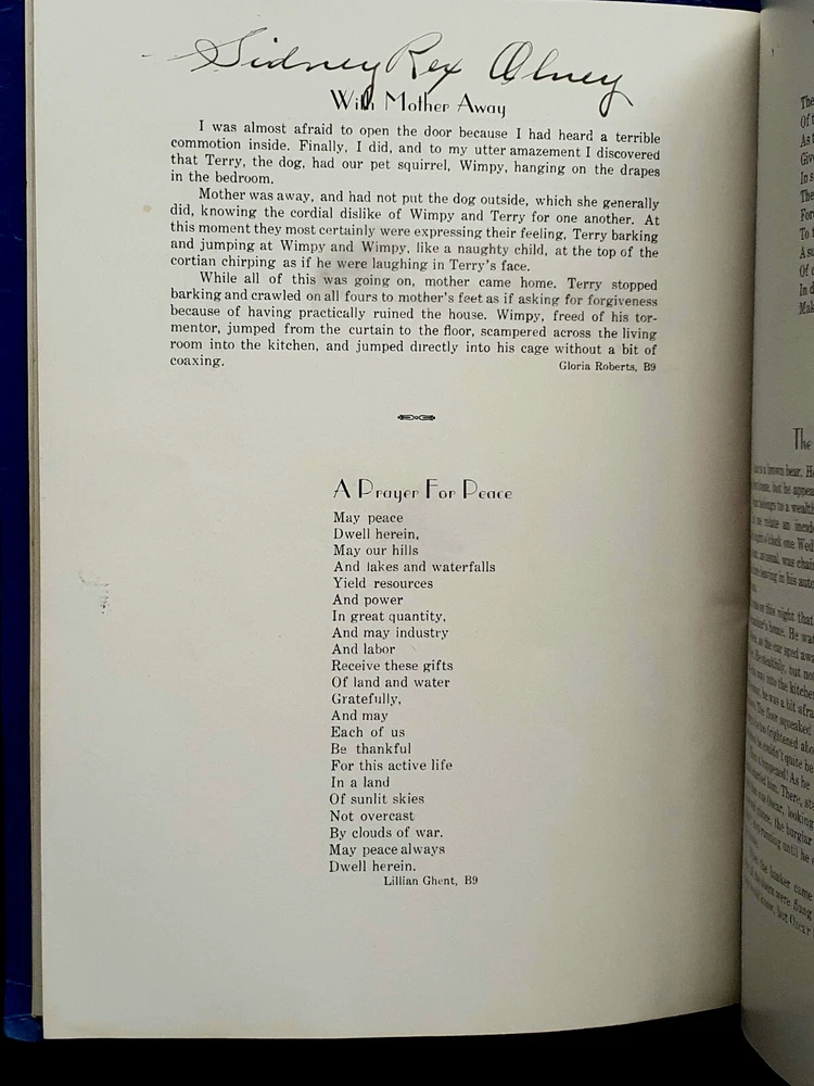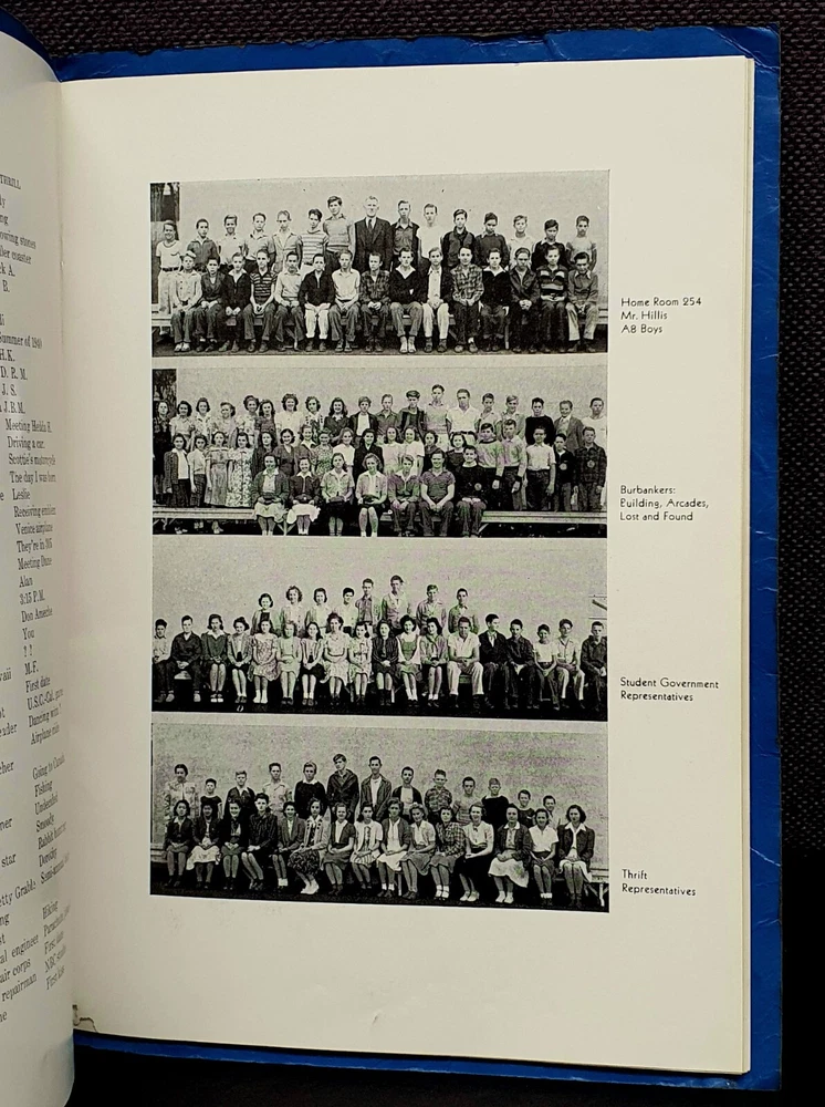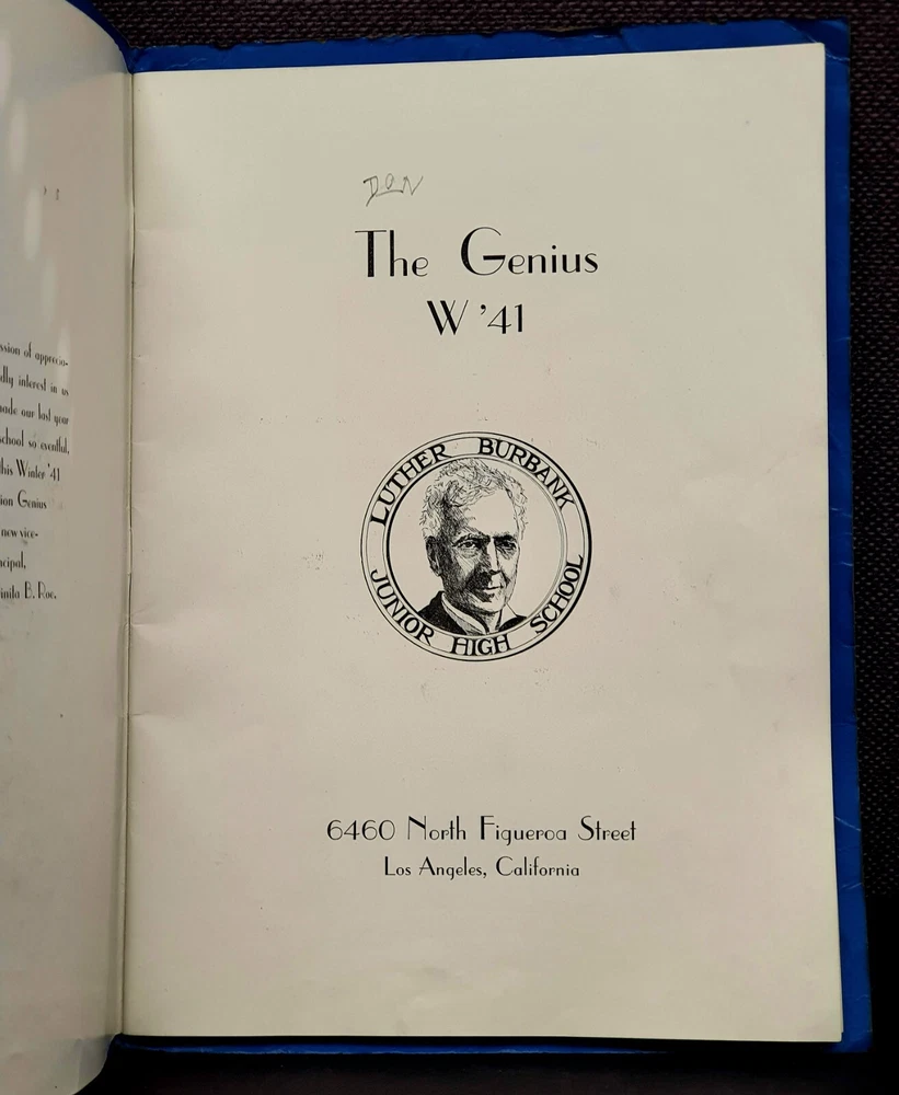 This yearbook is from the Winter 1941 track of Luther Burbank Junior High School, published on the cusp of WWII. The school was built in 1927. The yearbook contains signatures and inscriptions. It measures approx 8 in x 11 in. It is in excellent condition with no torn or loose pages. Pages are bright and un-yellowed. One rhyming inscription says: “When you get married and get in bed, Think of me and go ahead!” Luther Burbank Junior High School is a rare example of an LAUSD junior high school building in Garvanza that pre-dates the 1933 Long Beach Earthquake, which subsequently did not require demolition or substantial reconstruction. Garvanza is a neighborhood in northeast Los Angeles, California. It's known for its diverse architecture, rich cultural history, and peaceful atmosphere. Luther Burbank (1849 - 1926) was an American botanist, horticulturist, and agricultural science pioneer. Burbank is best known for developing the Idaho russet potato. His other developments include: 113 varieties of plums and prunes, 10 varieties of berries, 50 varieties of lilies, The Freestone peach, and An improved spineless cactus for desert livestock (the City of Burbank was named after a David Burbank).