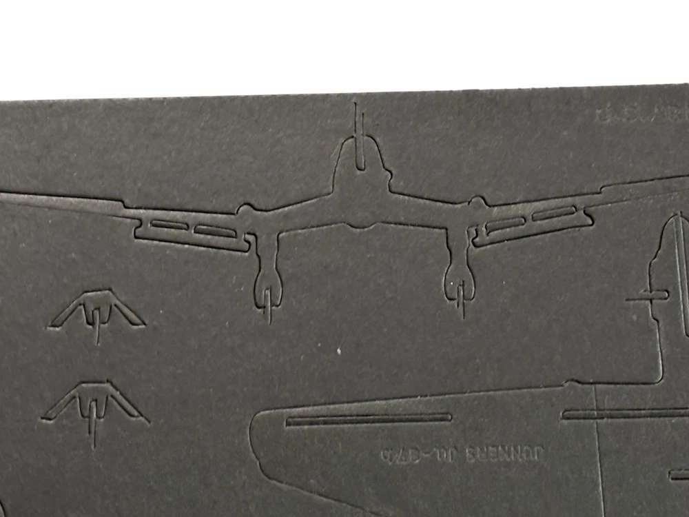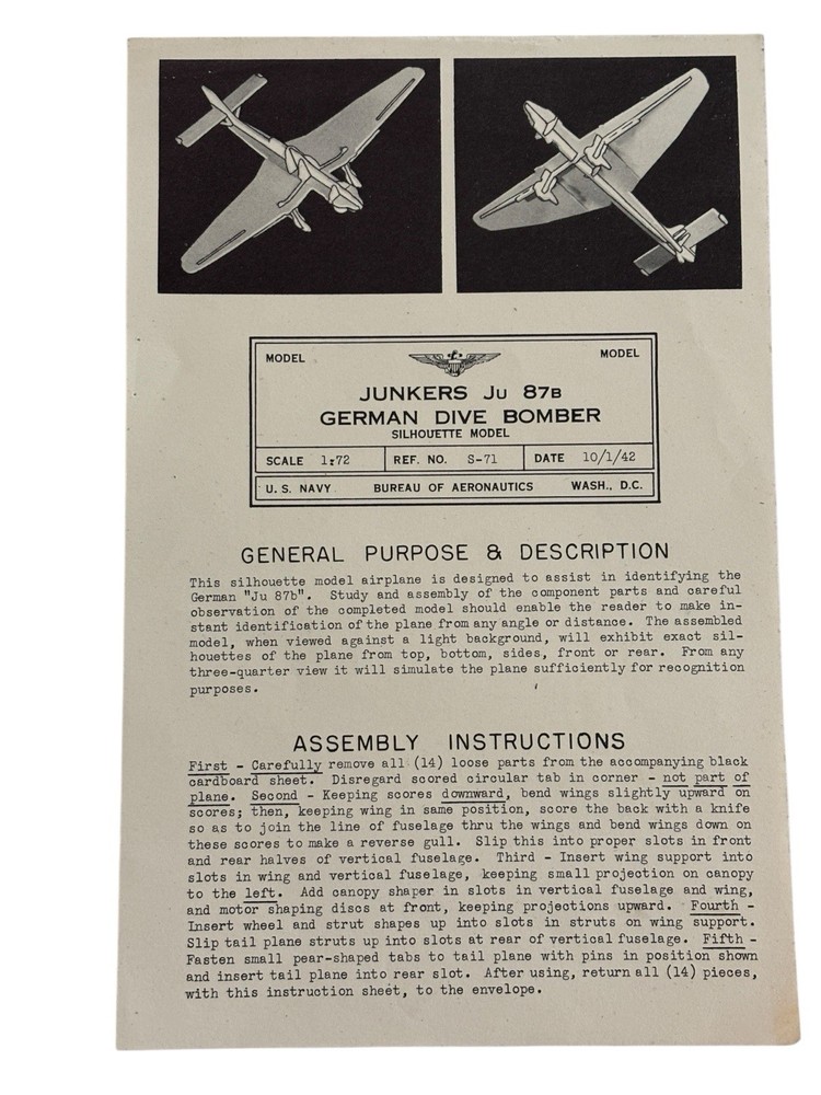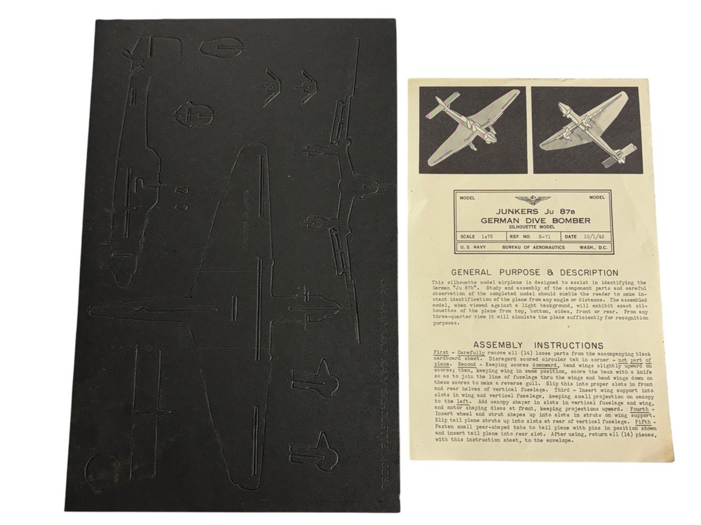 Model: German Junkers Ju 87B Dive Bomber Ref. No: S-71 Maker: U.S Army & U.S. Navy Silhouette Model - Bureau Of Aeronautics - Wash D.C. This is New Old Stock. This is the first series of these Aircraft Identification Silhouette Models that were made to teach aircraft spotters how to identify planes they scan for. These silhouette models are in unpunched condition. This one is dated 10/1/1942 and are scale 1:72. This model is 11"x7". They will come with original instructions or printed instructions. Most of what you find are from 1943 and instructions are printed on envelopes but these have their own sheet and came in blank envelopes. Coca Cola supported this effort as they support the WWII American effort in many different ways. We will be listing more silhouette models of Japan, British, German and U.S . There will be different sizes. HISTORY: Cardboard "silhouette" recognition training models as used during World War II were pioneered by the Special Devices Section of the US Navy's Bureau of Aeronautics, beginning in 1941. Not content to let the Navy lead anything, the USAAF started to produce a few of the same models under their own aegis. (See below for distinguishing markings.) Eventually the military forces decided to cooperate rather than compete, and the "Joint Services" sets were released. All of these models/sets had a date of 2/22/43. Set "A" had 78 models in it. Set "B" had a subset of 50 models in it. The military decided to focus on then-current front-line combat aircraft, so the earlier models of obsolete aircraft fell by the wayside, making them some of the rarest collectibles around today. The 78 models were grouped by country. For example, CM-1 through CM-17 are models of Japanese planes, CM-101 to CM-114 are of German planes, CM-501 to CM-531 are of US planes, and CM-601 to CM-616 are of British planes. As a rule of thumb, whenever you see a CM-xxx number you know that it is from the Army/Navy Joint Services effort. Any S-yyy reference numbered model is from the earlier stand-alone USN effort. There were a few cooperative Army/Navy models which were issued just prior to the boxed sets. For example, some number of the CM-xxx models were issued individually and dated between November 1942 and January 1943. Thereafter, all models were dated 2/22/43 and were intended for distribution in boxed sets. The early USN program used blank envelopes which were inked with the name of the model. The instructions were printed on a separate sheet of paper which was then inserted into the paper sleeve. By the time the Joint Services boxed sets were issued, every envelope had the assembly instructions printed on the outside, probably to prevent the accidental loss of the instruction sheet. A company called Burton-Rodgers, in Cincinnati, Ohio, made these silhouette models for the military. B-R was formerly known as "Co-operative Displays", a company founded in 1934. The name was changed in 1943 because displays were no longer the sole product of the company. "Co-operative Displays" continued as a division of Burton-Rodgers, and began offering sets of models to the public, as well. This effort began in March 1943 just after the contents of the boxed sets were finalized, and the models were used extensively by "plane spotters" of the Aircraft Warning Service (AWS). These models were a creative way to ship a two-dimensional panel from which a 3D model could then be assembled. The process of assembly was intended to reinforce the design elements of the aircraft in the mind of the builder. These ID training models were intended to be viewed from about ~36 feet away. That is about 1/2 mile at scale, and was the effective range of the weapons of the era. At 30+ feet they make for remarkably realistic viewing. According to published sources, about 7 million models were produced of 142 aircraft types. They were cheap, flimsy, and expendable, and many a serviceman whiled away the boring hours crossing the ocean by assembling models and then sailing them over the side of the ship! Not many have survived. In fact, about a dozen of the early S-series models still remain to be identified. The reference number exists, but no one knows what plane was assigned that particular number.