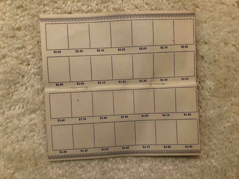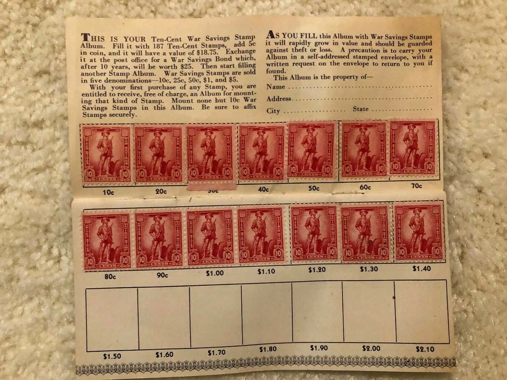1942 WWII Savings Bond Stamp Album with 14 10 cent stamps glued in. Front has a note from the Kiwanis Club on how to use the booklet and wishing a very Merry Christmas. The stamps were purchased at elementary school and later redeemed for a savings bond. Nice condition, see photos.