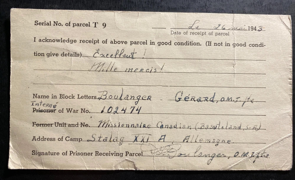 Up for auction is a beautiful stampless prisoner of war postcard cover from Germany, sent by a Canadian POW at Stalag 21A to The Canadian Red Cross . Dated In May 29, 1943. Beautiful cancels and markings. In excellent condition. Priced to sell. Nice postal history cover. On the front it is stamped Stalag 21A Sender is a soldier named Gerard Boulanger basutoland Canadian missioner . Parcel receipt