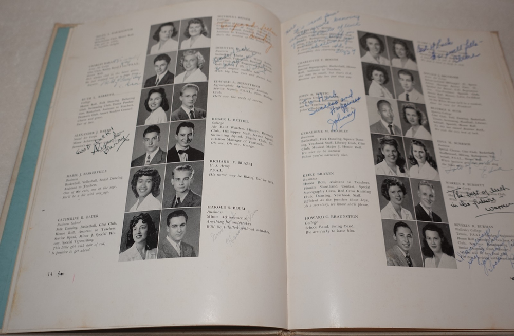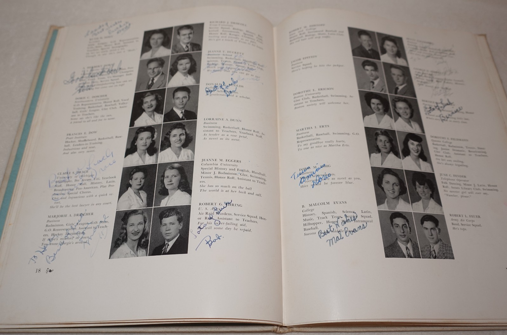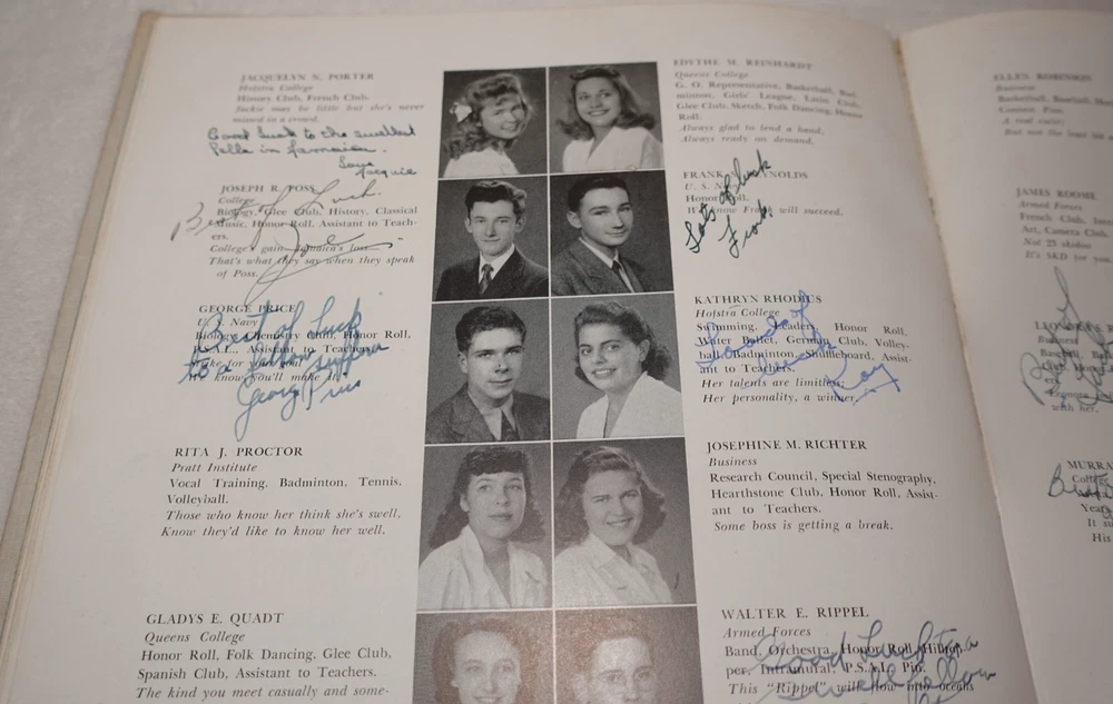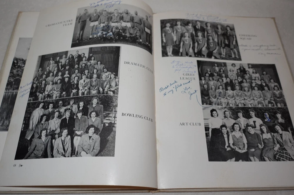 1944 Jamaica High School Queens New York Vintage Original Yearbook Over 200 Signatures Approximately 221 Signatures. Measures approximately 8 5/8" x 11 3/8". 60 Pages. Item is in vintage condition with dinged edges and corners, edge tearing, edge fraying, heavy staining to the covers and along the binding, indentions, age discoloration and marks. There is staining and discoloration inside the front and back covers. Yearbook has writing and marks throughout the publication. Please see photos for more information on condition and ask any questions you may have.