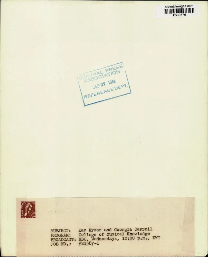 ebay template Note: Please study the images carefully to determine the condition of this vintage photograph, as it may not be in perfect condition. It may contain wrinkles, cracks, and possibly even tears due to its age and how it was handled before it got to us. A scanner may interpret colors and contrast differently than human eyes will, so it is possible that the actual photograph may be slightly darker or lighter in person. This vintage photograph is offered for sale as a collectible item and conveys no transfer of copyright. 1944 Press Photo Musicians Kay Kyser, Georgia Carroll of Musical Quiz Show This is an original press photo. Subjects: Kay Kyser and Georgia Carroll, Program: “College of Musical Knowledge," Broadcast: NBC, Wednesdays, 10:00 p.m. EWTPhoto measures 8.25 x 10inches. Photo is dated 09-27-1944. PHOTO FRONT PHOTO BACK Historic Images Part Number: kfx39576 Sell Smarter with Kyozou. Inventory and Ecommerce Management