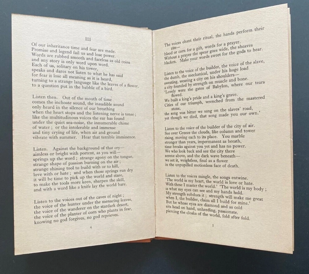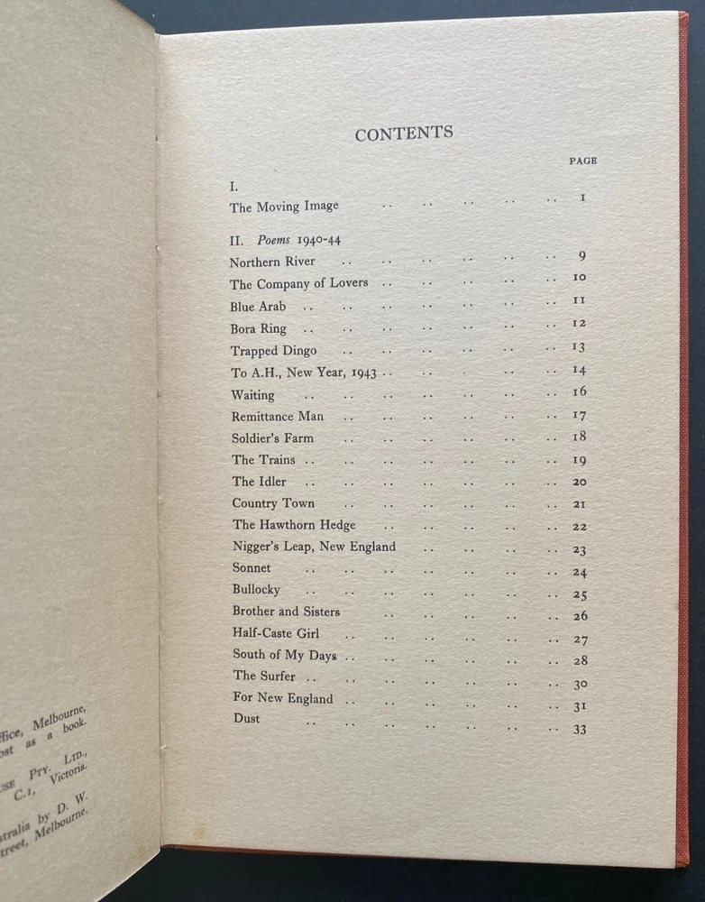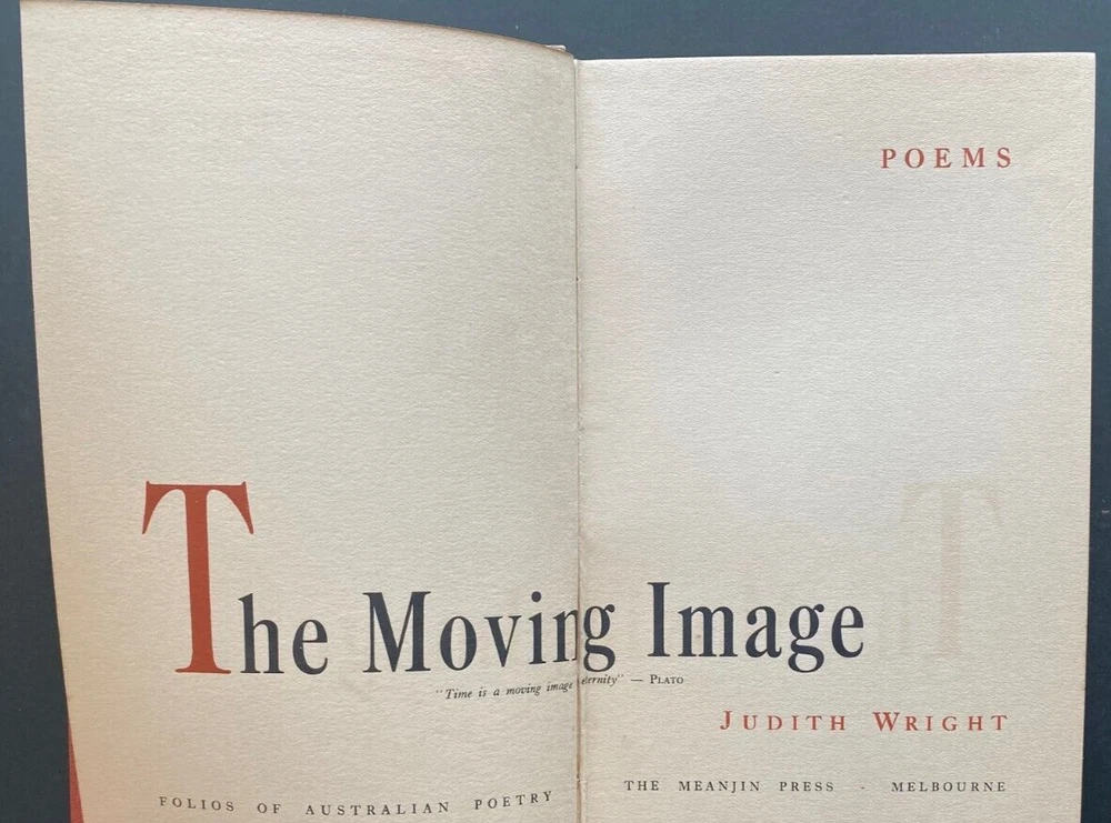 Express Shipping Australia Wide is Free The Moving Image By Judith Wright Published by The Meanjin Press, Melbourne, no date but 1946 First Edition Hardcover in cinnamon cloth, with titles in black to the front cover, and to the spine, with the dustjacket, in 33 pages. This volume is a collection of poetry, though it's sometimes referred to as a work that also explores the themes of human experience, relationships, and the world through vivid imagery. Judith Wright, one of Australia's most renowned poets, was known for her skill in creating powerful, often emotive poems that reflect both the natural world and personal human struggles. The book's title, The Moving Image , can be interpreted in various ways. It may refer to the fluid and shifting nature of life and the human condition, as captured through Wright's poetic imagery. Her poems explore themes such as nature, spirituality, human emotion, and the complexities of identity. The title also suggests the way Wright’s poetry brings to life vivid, often moving images in the reader’s mind. Throughout the collection, Wright's work reveals a deep connection to the land and the environment, while also exploring social, political, and emotional themes. As one of the leading voices of Australian poetry in the 20th century, Wright's works often engage with the tensions between Australia's colonial past and the Indigenous cultures, and her reflections on the natural world are interwoven with broader philosophical and existential reflections. The poems in The Moving Image showcase Wright’s characteristic lyricism and emotional depth, capturing human experience and nature with a sense of poignant beauty. The collection is a significant work in Wright’s career, solidifying her as an important voice in Australian literature. There is light shelfwear. There is no foxing. There is offsetting to the endpapers. There is some sunning. There are no previous owners' names or inscriptions. There are no missing, loose, creased, stained, or damaged pages. The spine and binding are solid. It is complete and original. Measures 14cm x 22cm. Express Shipping Australia Wide is Free All items are securely and well packed. Thank you for viewing my item.