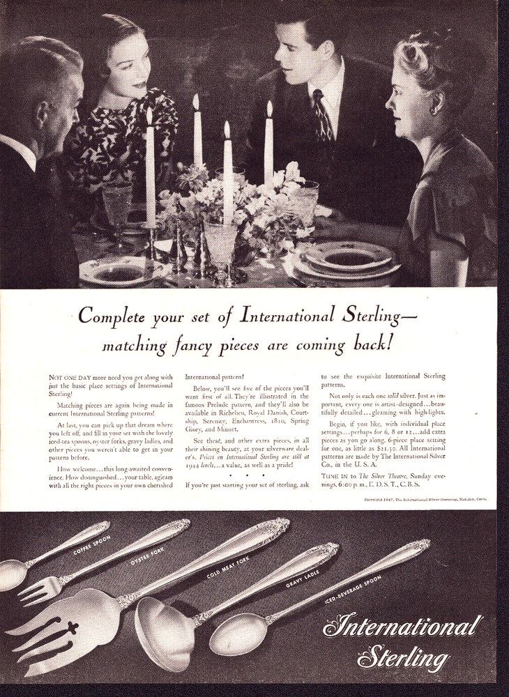 1947 International Sterling Silverware - Matching Fancy Pieces - Vtg Print Ad Condition: Used; original vintage condition with typical age-related wear, including slight age toning. Despite these signs of age, the ad retains its visual appeal and is suitable for collectors and enthusiasts. See photos for details. Description: This 1947 advertisement features International Sterling Silverware, highlighting the return of matching fancy pieces to complete your collection. The ad showcases detailed illustrations of pieces like the gravy ladle, cold meat fork, and coffee spoon in exquisite patterns such as Prelude, Royal Danish, and Spring Glory. An elegant vintage dinner setting reinforces the timeless beauty of International Sterling silverware, perfect for collectors or those seeking vintage charm. Details: Year: 1947 Category: Silverware Brand: International Sterling Product: Silverware Color: Black & White Features: Authentic vintage magazine advertisement Size: Approx. 10 ¼ x 13 ½ inches Shipping: Packaged with care in a rigid mailer for protection. Combined shipping available for multiple ads. Why Buy This Item: This rare 1947 International Sterling ad evokes the elegance of post-war America, showcasing timeless silver patterns. Perfect for framing or gifting to a collector, this ad combines historical significance with classic design. Visit My Store: Check out more vintage items at Kelly Vintage Market ! r1