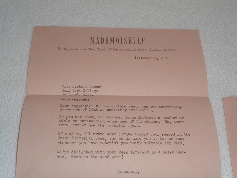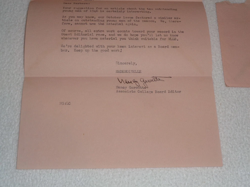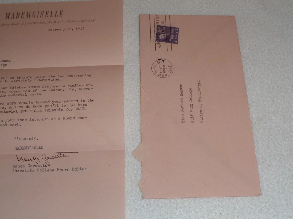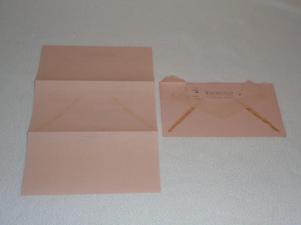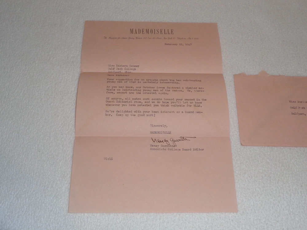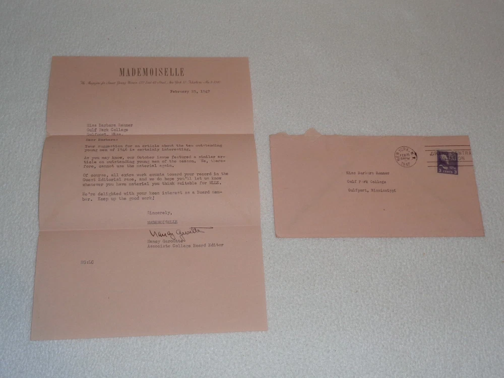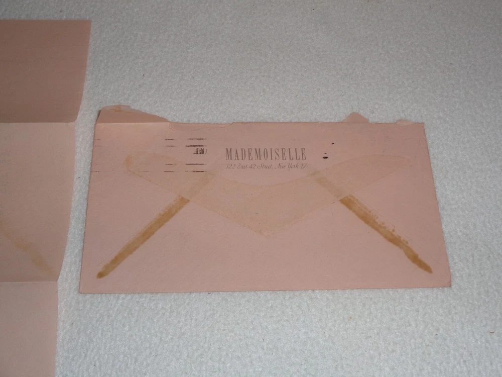 Vintage Original 1947 Mademoiselle Magazine Women Fashion Rare Letter Nancy Garoutte The letter is signed by Nancy Garoutte, Associate College Board Editor. Letter measures approximately 7 1/4" x 10 1/2". 1 Page. Includes original envelope, which measures around 3 7/8" x 7 1/2". Items are in vintage condition with discoloration, creasing, and marks. There is staining to the letter and envelope. The letter was folded. There is heavier tearing to the envelope where it was opened. Please see photos for more information on condition and ask any questions you may have. This would be a nice addition to any collection.