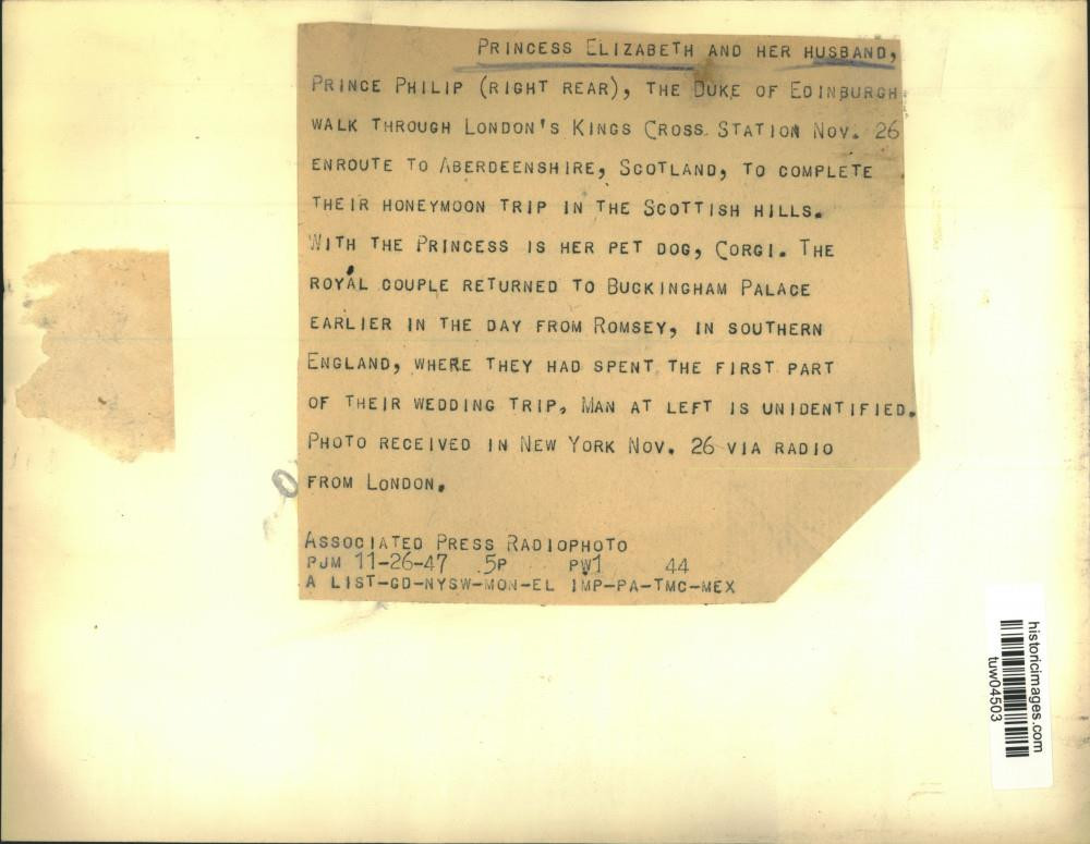 ebay template Note: Please study the images carefully to determine the condition of this vintage photograph, as it may not be in perfect condition. It may contain wrinkles, cracks, and possibly even tears due to its age and how it was handled before it got to us. A scanner may interpret colors and contrast differently than human eyes will, so it is possible that the actual photograph may be slightly darker or lighter in person. This vintage photograph is offered for sale as a collectible item and conveys no transfer of copyright. 1947 Press Photo Princess Elizabeth & Prince Philip in London, England This is an original press photo. England - Princess Elizabeth and her husband, Prince Philip (right rear), the Duke of Edinburgh, walk through London's Kings Cross Station November 26 enroute to Aberdeenshire, Scotland, to complete their honeymoon trip in the Scottish hills. With the Princess is her pet dog, Corgi. The royal couple returned to Buckingham Palace earlier in the day from Romsey, in southern England, where they had spent the first part of their wedding trip. Man at left is unidentified. Photo received in New York November 26 via radio from LondonPhoto measures 7.25 x 9.25inches. Photo is dated 11-26-1947. PHOTO FRONT PHOTO BACK Historic Images Part Number: tuw04503 FAQs Q: Can I just download a digital version instead? A: No, we sell only vintage originals and do not make or distribute any copies, including digital ones. Q: Do you combine shipping and invoices? A: Multiple photos won on the same seller ID combine automatically through the eBay checkout process. If you encounter problems with this, send us a message via eBay messaging and we will send you an invoice. Due to eBay limitations, we cannot combine items won on our different seller IDs for a single shipping charge. Q: How quickly do you ship the items once paid? A: We ship within one business day after your payment clears. If you do not receive an "order shipped" email from us by the close of the second business day from submitting payment, please e-mail us via eBay messaging. Q: How do you make sure my photograph arrives safely? A: We package each order between two cross-corrugated pieces of cardboard to ensure that the package is as difficult to bend as possible. We then wrap each order in a plastic sheet to help protect against moisture. We want you to rest assured that we take every precaution to ensure that the photograph you receive will be in the same condition in your care as it was in ours. Q: Will the "Historic Images" watermark be on my photo when I receive it? A: No. This is a digital watermark we use to protect our images. It is not printed on the photo. Q: What are your office hours? A: eBay for us is a business, and a very fun one to be in! We are open M-F 9 to 5 (CST). Therefore, we do not return e-mails and phone calls over the weekend. We observe the following holidays: New Years Day, Memorial Day, Fourth of July, Labor Day, Thanksgiving and the day after Thanksgiving, Christmas Eve and Christmas Day. Q: Where did all these vintage photos come from? A: These original vintage photographs are from various news service and newspaper photo archives from locations around the country including: Boston, Detroit, Tampa, Chicago, Denver, Seattle, New Orleans, Milwaukee, Portland, Spokane, and more. We do not copy or reproduce any photographs -- every item is a unique vintage piece that was housed in a news archive. Q: Can I use this photograph in my book/blog/website? A: The short answer is no. There is no transfer of copyright for republication or reproduction with these photographs when you purchase them, and only photographs taken before 1923 are currently automatically in the public domain. Permission from the copyright holder, which usually can be identified from the back of each photo, must be sought to republish or reproduce the image for any purpose. Q: Do you relist items (in case I miss an auction ending)? A: Auction items that receive no bids are relisted in our store (historicimages-store on eBay) as a fixed-price item and at a higher price than the starting auction price. Q: Do you leave feedback? A: Yes, we always leave feedback for buyers. Our software monitors when our buyers leave us feedback, then notifies us that we can leave feedback for the buyer. Rest assured, if you leave feedback, we will do the same! Check out our family of eBay IDs: historicimages01 Sports Photos historicimages02 Entertainment Photos historicimages03 Americana Photos historicimages04 International & War Photos historicimages05 Transportation Photos historicimages06 Photos of All Subjects historicimages07 Entertainment Photos historicimages08 Newsworthy Photos historicimages09 Entertainment Photos historicimages10 Sports Photos historicimages-store Our largest fixed-price selection historicimages-gallery Hand-picked photos Saturday night auctions About Us Historic Images was formed in September 2009, with a handful of scanners working out of a basement to digitize newspaper photo archives. We have since moved out of the basement, and we can now archive thousands of photos per day. Our company has worked with magazines and newspapers from Detroit, Boston, Denver, Seattle, Tampa, Chicago, and New Orleans, just to name a few. We are constantly adding to our inventory, and have assembled an archive of millions of photos to date. As our company evolved, we began our eBay business, which brings thousands of fresh auctions per week to the world's largest online auction marketplace. Our custom software systems and team of great employees allow us to efficiently scan and sell large photo archives online. At the very core of our company's DNA is a strong commitment to customer satisfaction and strict integrity for our product. Our promise to you is that we will do everything in our power to provide you a great buying experience. Copyright 2009 - Present, Historic Images, Inc. Sell Smarter with Kyozou. Inventory and Ecommerce Mana
