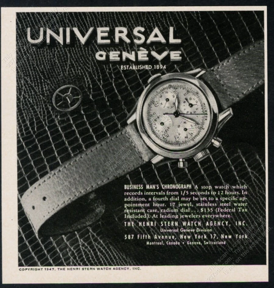 This is an original 1947 print ad for Universal Geneve! It measures approximately 5.25" x 5" overall, has no stains or tears, comes from a dry, high-altitude, smoke-free environment, and is strictly graded "Very Fine". This vintage ad is not any kind of later reproduced, photocopied, or reprinted copy (most ads were published at one time only, and never commercially reproduced). An unusual and distinctive piece for your frame. Our listings show the actual item you will receive, we do not use stock images. THANK YOU for the opportunity to earn your business. Thank you for helping us celebrate our 27TH YEAR on ebay! Watch for our special sales through the year. t237iii 329178 We ship worldwide. We will combine as many items in one package as you want, to save shipping costs. Buy 10 or more items and the shipping is FREE. Use the ebay shopping cart so that there is only one payment, please. We ship six days every week, and if your payment arrives before Noon Mountain Time, your package goes out that same day. Our box shipping tubes work perfectly for most items, unless the item is too thick or is of the fold-out type; those will need to be shipped flat. All items which are shipped flat come with a clear sleeve and a nice, substantial backing board, not a cheap flimsy one. Who Buys Our Vintage Ads? Over the past 27 years on ebay, our customers have included museums, galleries, national archives, concert halls, corporate archives, universities, TV and film production companies, private collectors and others in over 100 countries on all seven continents-- yes, including a person stationed in Antarctica. If you've seen print ads used in set decoration for TV shows or films, you've likely seen our ads. If you've looked in major store display windows in New York at Christmastime, you've likely seen our ads. We've been lucky enough to have worked with some of the best in a wide variety of industries, and are looking forward to working with you too. Please let us know if you have any questions prior to purchase.