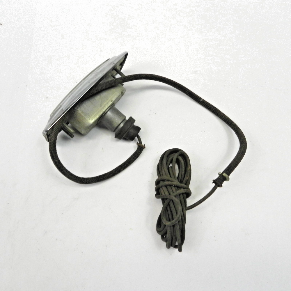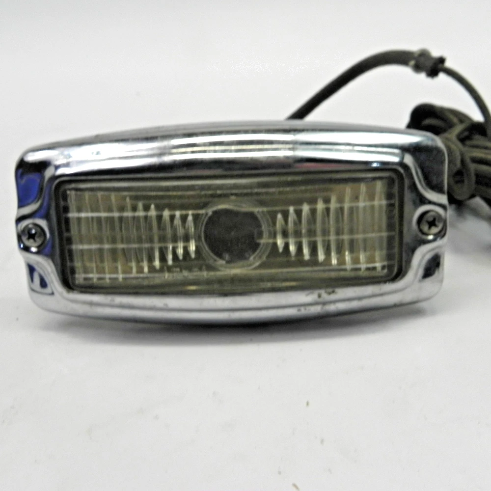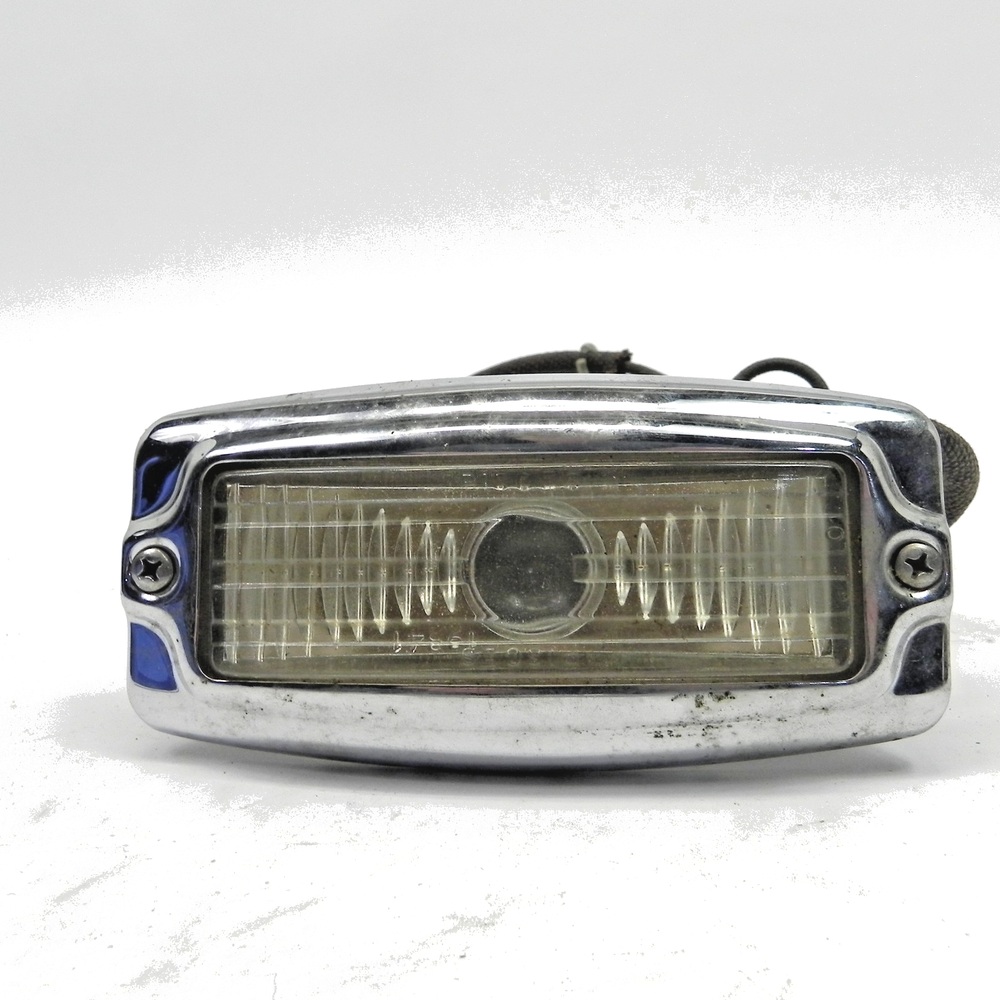 The 1947-1948 Kaiser-Frazer NOS back-up light accessory assembly with wiring is a rare vintage part made in the United States. This tail light assembly features a red incandescent light with a chrome housing, designed for mounting with screws on the rear of the vehicle. It is a unique and authentic piece for collectors or enthusiasts of classic cars looking to restore or enhance the lighting system of their vehicles.