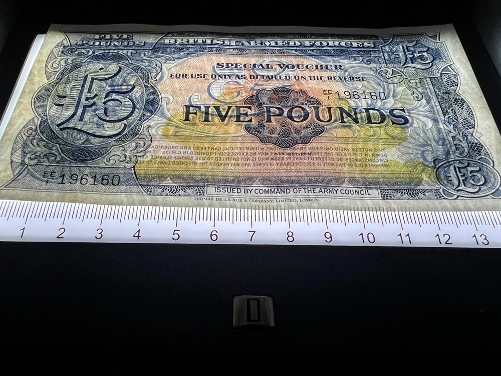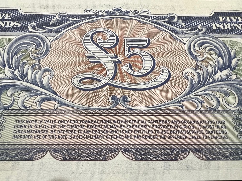 1948 British 5 Pound Armed Forces Banknote Special Voucher WW2 WWII War Money One authentic 1948 British Armed Forces special voucher 5 pound banknote. These notes are in uncirculated condition in the sense that they have not been actively used. I have an original bundle of these but due to improper storage, some banknotes have a small spec of water damage on one corner. Most notes are in pristine uncirculated condition. Per the pictures, I have confirmed these banknotes to be authentic, they have a watermark in the paper. I have also examined them under a microscope. Serial numbers on these bills will be different from those in the pictures. If you have any questions, feel free to ask. Shipping Returns Shipping Returns I offer FREE shipping on all orders in the United States! Your order will be shipped within 1 working day of receiving payment (Monday-Friday) and you should expect to receive it within 2 to 5 days after dispatch. Although somewhat rare, sometimes USPS is slow and can take up to 7 days to deliver your order. Your order will arrive in a yellow envelope. In the very unlikely event that your item is lost or damaged during post, then I am responsible and will issue either a full refund or replacement. If you do not receive your order within 7 days after it is shipped, please send me a message and I will work with you to solve the issue. I offer refunds or replacement in scenarios where items are lost or damaged in mail. If you are not 100% satisfied with your purchase, you can return the product and get a full refund or exchange the product for another one, be it similar or not. You can return a product up to 30 days after you purchased it. Any product you return must be in the same condition you received it and in the original packaging. Please keep the receipt. One authentic 1948 British Armed Forces special voucher 5 pound banknote. These notes are in uncirculated condition in the sense that they have not been actively used. I have an original bundle of these but due to improper storage, some banknotes have a small spec of water damage on one corner. Most notes are in pristine uncirculated condition. Per the pictures, I have confirmed these banknotes to be authentic, they have a watermark in the paper. I have also examined them under a microscope. Serial numbers on these bills will be different from those in the pictures. If you have any questions, feel free to ask. 1948 British 5 Pound Armed Forces Banknote Special Voucher WW2 WWII War Money One authentic 1948 British Armed Forces special voucher 5 pound banknote. These notes are in uncirculated condition in the sense that they have not been actively used. I have an original bundle of these but due to improper storage, some banknotes have a small spec of water damage on one corner. Most notes are in pristine uncirculated condition. Per the pictures, I have confirmed these banknotes to be authentic, they have a watermark in the paper. I have also examined them under a microscope. Serial numbers on these bills will be different from those in the pictures. If you have any questions, feel free to ask. Shipping I offer FREE shipping on all orders in the United States! Your order will be shipped within 1 working day of receiving payment (Monday-Friday) and you should expect to receive it within 2 to 5 days after dispatch. Although somewhat rare, sometimes USPS is slow and can take up to 7 days to deliver your order. Your order will arrive in a yellow envelope. In the very unlikely event that your item is lost or damaged during post, then I am responsible and will issue either a full refund or replacement. If you do not receive your order within 7 days after it is shipped, please send me a message and I will work with you to solve the issue. I offer refunds or replacement in scenarios where items are lost or damaged in mail. Returns If you are not 100% satisfied with your purchase, you can return the product and get a full refund or exchange the product for another one, be it similar or not. You can return a product up to 30 days after you purchased it. Any product you return must be in the same condition you received it and in the original packaging. Please keep the receipt. One authentic 1948 British Armed Forces special voucher 5 pound banknote. These notes are in uncirculated condition in the sense that they have not been actively used. I have an original bundle of these but due to improper storage, some banknotes have a small spec of water damage on one corner. Most notes are in pristine uncirculated condition. Per the pictures, I have confirmed these banknotes to be authentic, they have a watermark in the paper. I have also examined them under a microscope. Serial numbers on these bills will be different from those in the pictures. If you have any questions, feel free to ask.