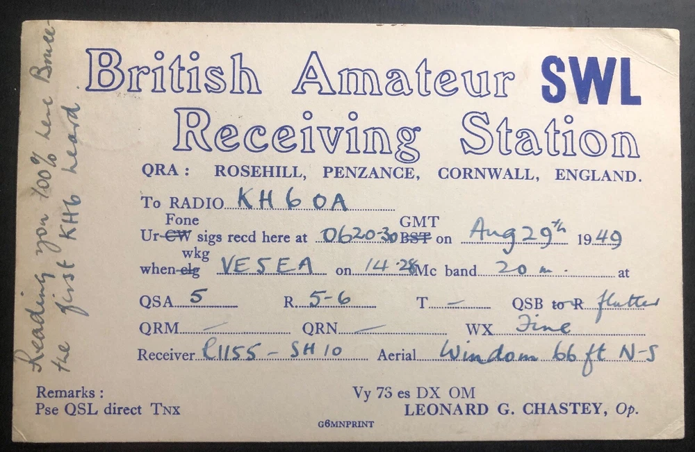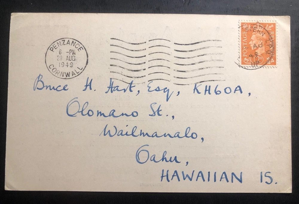 Up for auction is an Postcard Cover Form British Amateur SWL station in Penzance england To Wailmanalo Hawaii . In good condition . Priced to sell. Very interesting postal history cover. Postmarked in August 29, 1949. Great stamp marks & cancels . *** For storage & shipping purposes the description page has been removed you only will get the cover ***