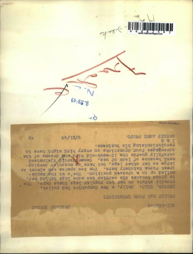 ebay template Note: Please study the images carefully to determine the condition of this vintage photograph, as it may not be in perfect condition. It may contain wrinkles, cracks, and possibly even tears due to its age and how it was handled before it got to us. A scanner may interpret colors and contrast differently than human eyes will, so it is possible that the actual photograph may be slightly darker or lighter in person. This vintage photograph is offered for sale as a collectible item and conveys no transfer of copyright. 1949 Press Photo Harold Hjelmstead carefully holds Emily,a New Hampshire pullet This is an original press photo. Denver, Colorado-Emily, a New Hampshire Red pullet is properly held by her owner Harold Hjelmstead. Emily has two spare legs behind her that are almost as large as her other legs.Photo measures 7 x 9.25inches. Photo is dated 09-21-1949. PHOTO FRONT PHOTO BACK Historic Images Part Number: ned82541 FAQs Q: Can I just download a digital version instead? A: No, we sell only vintage originals and do not make or distribute any copies, including digital ones. Q: Do you combine shipping and invoices? A: Multiple photos won on the same seller ID combine automatically through the eBay checkout process. If you encounter problems with this, send us a message via eBay messaging and we will send you an invoice. Due to eBay limitations, we cannot combine items won on our different seller IDs for a single shipping charge. Q: How quickly do you ship the items once paid? A: We ship within one business day after your payment clears. If you do not receive an "order shipped" email from us by the close of the second business day from submitting payment, please e-mail us via eBay messaging. Q: How do you make sure my photograph arrives safely? A: We package each order between two cross-corrugated pieces of cardboard to ensure that the package is as difficult to bend as possible. We then wrap each order in a plastic sheet to help protect against moisture. We want you to rest assured that we take every precaution to ensure that the photograph you receive will be in the same condition in your care as it was in ours. Q: Will the "Historic Images" watermark be on my photo when I receive it? A: No. This is a digital watermark we use to protect our images. It is not printed on the photo. Q: What are your office hours? A: eBay for us is a business, and a very fun one to be in! We are open M-F 9 to 5 (CST). Therefore, we do not return e-mails and phone calls over the weekend. We observe the following holidays: New Years Day, Memorial Day, Fourth of July, Labor Day, Thanksgiving and the day after Thanksgiving, Christmas Eve and Christmas Day. Q: Where did all these vintage photos come from? A: These original vintage photographs are from various news service and newspaper photo archives from locations around the country including: Boston, Detroit, Tampa, Chicago, Denver, Seattle, New Orleans, Milwaukee, Portland, Spokane, and more. We do not copy or reproduce any photographs -- every item is a unique vintage piece that was housed in a news archive. Q: Can I use this photograph in my book/blog/website? A: The short answer is no. There is no transfer of copyright for republication or reproduction with these photographs when you purchase them, and only photographs taken before 1923 are currently automatically in the public domain. Permission from the copyright holder, which usually can be identified from the back of each photo, must be sought to republish or reproduce the image for any purpose. Q: Do you relist items (in case I miss an auction ending)? A: Auction items that receive no bids are relisted in our store (historicimages-store on eBay) as a fixed-price item and at a higher price than the starting auction price. Q: Do you leave feedback? A: Yes, we always leave feedback for buyers. Our software monitors when our buyers leave us feedback, then notifies us that we can leave feedback for the buyer. Rest assured, if you leave feedback, we will do the same! Check out our family of eBay IDs: historicimages01 Sports Photos historicimages02 Entertainment Photos historicimages03 Americana Photos historicimages04 International & War Photos historicimages05 Transportation Photos historicimages06 Photos of All Subjects historicimages07 Entertainment Photos historicimages08 Newsworthy Photos historicimages09 Entertainment Photos historicimages10 Sports Photos historicimages-store Our largest fixed-price selection historicimages-gallery Hand-picked photos Saturday night auctions About Us Historic Images was formed in September 2009, with a handful of scanners working out of a basement to digitize newspaper photo archives. We have since moved out of the basement, and we can now archive thousands of photos per day. Our company has worked with magazines and newspapers from Detroit, Boston, Denver, Seattle, Tampa, Chicago, and New Orleans, just to name a few. We are constantly adding to our inventory, and have assembled an archive of millions of photos to date. As our company evolved, we began our eBay business, which brings thousands of fresh auctions per week to the world's largest online auction marketplace. Our custom software systems and team of great employees allow us to efficiently scan and sell large photo archives online. At the very core of our company's DNA is a strong commitment to customer satisfaction and strict integrity for our product. Our promise to you is that we will do everything in our power to provide you a great buying experience. Copyright 2009 - Present, Historic Images, Inc. Sell Smarter with Kyozou. Inventory and Ecommerce Management