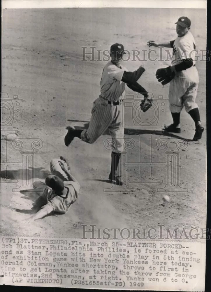 ebay template Note: Please study the images carefully to determine the condition of this vintage photograph, as it may not be in perfect condition. It may contain wrinkles, cracks, and possibly even tears due to its age and how it was handled before it got to us. A scanner may interpret colors and contrast differently than human eyes will, so it is possible that the actual photograph may be slightly darker or lighter in person. This vintage photograph is offered for sale as a collectible item and conveys no transfer of copyright. 1949 Press Photo Philadelphia Phillies vs New York Yankees, baseball game, FL This is an original press photo. Coleman, Gerald (Baseball). St. Petersburg, Florida. Bob Blattner, Philadelphia Phillies, is forced at second as Stan Lopata hits into double play in fifth inning of exhibition game with New York Yankees here today. Gerald Coleman, Yankee shortstop, throws to first in time to get Lopata after taking the throw from George Stirnweiss, second baseman, at right. Yanks won 6 to 0.Photo measures 7 x 9.75inches. Photo is dated 3-25-1949. PHOTO FRONT PHOTO BACK Historic Images Part Number: pix11648 FAQs Q: Can I just download a digital version instead? A: No, we sell only vintage originals and do not make or distribute any copies, including digital ones. Q: Do you combine shipping and invoices? A: Multiple photos won on the same seller ID combine automatically through the eBay checkout process. If you encounter problems with this, send us a message via eBay messaging and we will send you an invoice. Due to eBay limitations, we cannot combine items won on our different seller IDs for a single shipping charge. Q: How quickly do you ship the items once paid? A: We ship within one business day after your payment clears. If you do not receive an "order shipped" email from us by the close of the second business day from submitting payment, please e-mail us via eBay messaging. Q: How do you make sure my photograph arrives safely? A: We package each order between two cross-corrugated pieces of cardboard to ensure that the package is as difficult to bend as possible. We then wrap each order in a plastic sheet to help protect against moisture. We want you to rest assured that we take every precaution to ensure that the photograph you receive will be in the same condition in your care as it was in ours. Q: Will the "Historic Images" watermark be on my photo when I receive it? A: No. This is a digital watermark we use to protect our images. It is not printed on the photo. Q: What are your office hours? A: eBay for us is a business, and a very fun one to be in! We are open M-F 9 to 5 (CST). Therefore, we do not return e-mails and phone calls over the weekend. We observe the following holidays: New Years Day, Memorial Day, Fourth of July, Labor Day, Thanksgiving and the day after Thanksgiving, Christmas Eve and Christmas Day. Q: Where did all these vintage photos come from? A: These original vintage photographs are from various news service and newspaper photo archives from locations around the country including: Boston, Detroit, Tampa, Chicago, Denver, Seattle, New Orleans, Milwaukee, Portland, Spokane, and more. We do not copy or reproduce any photographs -- every item is a unique vintage piece that was housed in a news archive. Q: Can I use this photograph in my book/blog/website? A: The short answer is no. There is no transfer of copyright for republication or reproduction with these photographs when you purchase them, and only photographs taken before 1923 are currently automatically in the public domain. Permission from the copyright holder, which usually can be identified from the back of each photo, must be sought to republish or reproduce the image for any purpose. Q: Do you relist items (in case I miss an auction ending)? A: Auction items that receive no bids are relisted in our store (historicimages-store on eBay) as a fixed-price item and at a higher price than the starting auction price. Q: Do you leave feedback? A: Yes, we always leave feedback for buyers. Our software monitors when our buyers leave us feedback, then notifies us that we can leave feedback for the buyer. Rest assured, if you leave feedback, we will do the same! Check out our family of eBay IDs: historicimages01 Sports Photos historicimages02 Entertainment Photos historicimages03 Americana Photos historicimages04 International & War Photos historicimages05 Transportation Photos historicimages06 Photos of All Subjects historicimages07 Entertainment Photos historicimages08 Newsworthy Photos historicimages09 Entertainment Photos historicimages10 Sports Photos historicimages-store Our largest fixed-price selection historicimages-gallery Hand-picked photos Saturday night auctions About Us Historic Images was formed in September 2009, with a handful of scanners working out of a basement to digitize newspaper photo archives. We have since moved out of the basement, and we can now archive thousands of photos per day. Our company has worked with magazines and newspapers from Detroit, Boston, Denver, Seattle, Tampa, Chicago, and New Orleans, just to name a few. We are constantly adding to our inventory, and have assembled an archive of millions of photos to date. As our company evolved, we began our eBay business, which brings thousands of fresh auctions per week to the world's largest online auction marketplace. Our custom software systems and team of great employees allow us to efficiently scan and sell large photo archives online. At the very core of our company's DNA is a strong commitment to customer satisfaction and strict integrity for our product. Our promise to you is that we will do everything in our power to provide you a great buying experience. Copyright 2009 - Present, Historic Images, Inc. Sell Smarter with Kyozou. Inventory and Ecommerce Management