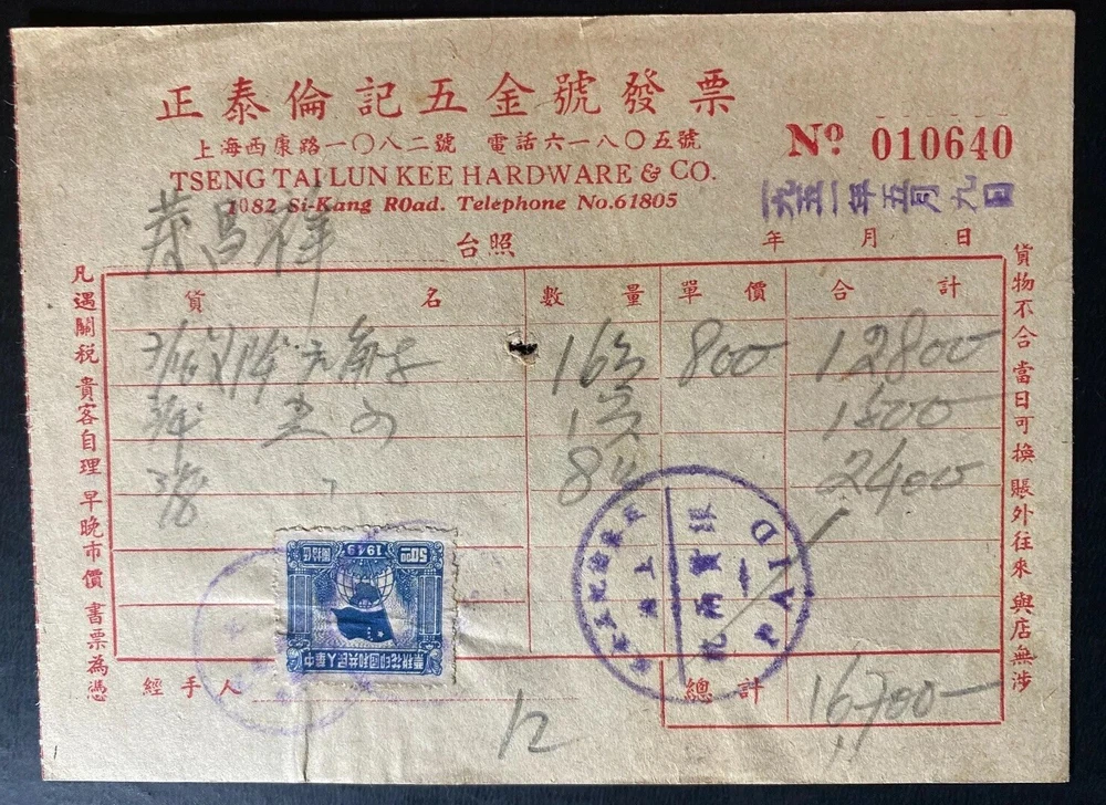 Up for auction is a beautiful revenue stamp receipt invoice cover from China . Great markings and cancels. In Good condition. Priced to sell. Postmarked in Chinese in 1950s . Nice postal History. Tseng Tai Lun Kee Hardware