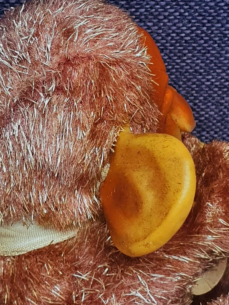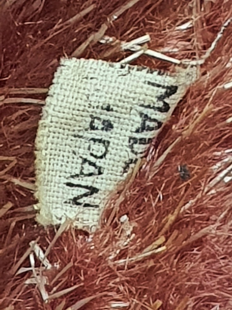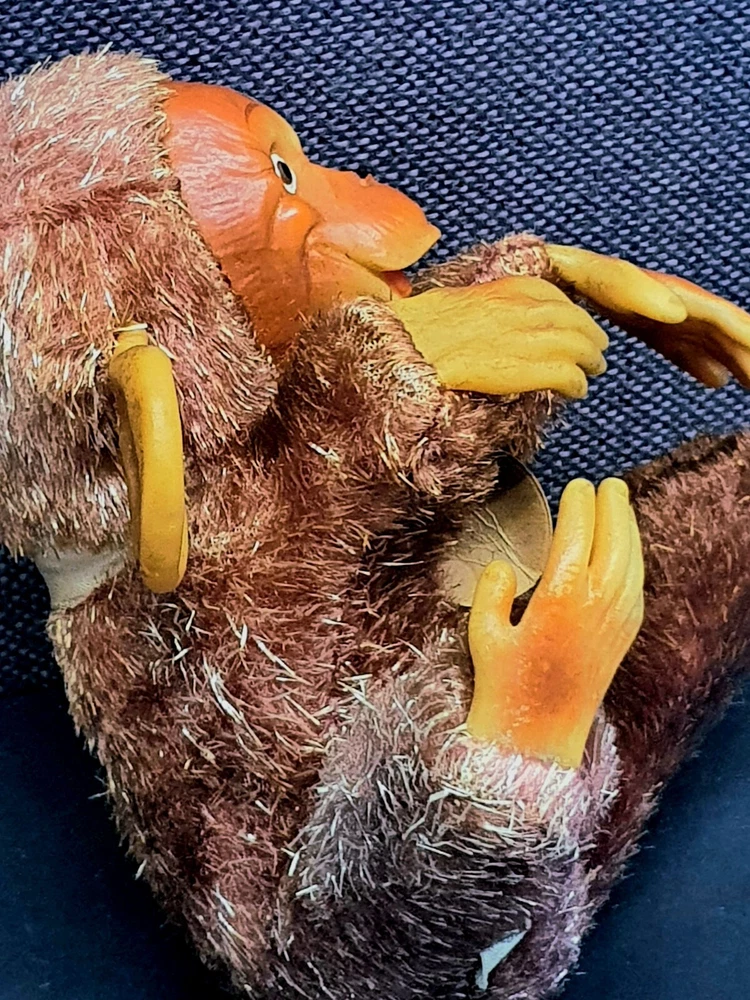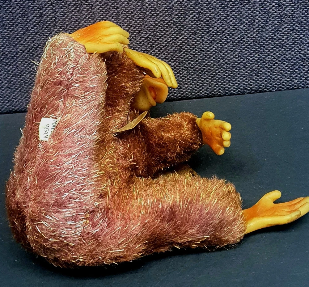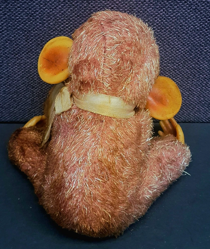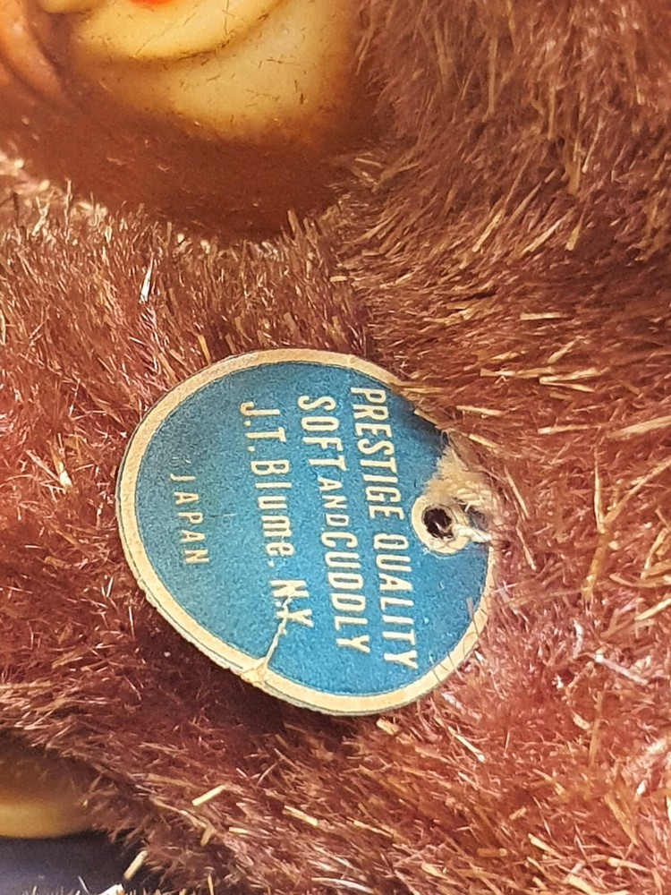This Chimp doll is approx 6.5 in tall (sitting) with a rubber face and ears, and rubber hands/feet (its feet are literally hands). It is stuffed with a straw-like material, with a covering of some type of coarse material (not soft to the touch). The stitchings are in a somewhat delicate state and appear to have loosened slightly. It has a sewn-in “Made In Japan” cloth tag, as well as a paper tag with the name of the import company, “J.T. Blume”. This item is most likely from the 1950s.