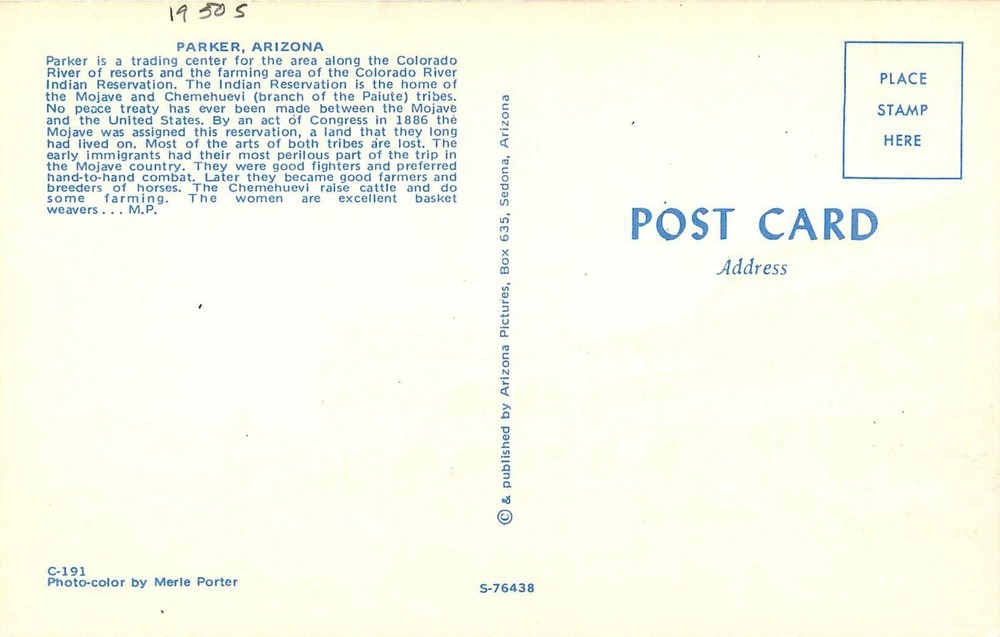 Type: Printed (Lithograph) Size: Standard (5.5 x 3.5 in) Country of Origin: United States Theme: Architecture, Cities & Towns, Famous Places, Tourism, Travel Subject: Hotel Original/Licensed Reprint: Original Country: United States Era: Photochrome (1939-Now) Continent: North America City: Parker Features: Chrome, Divided Back Postage Condition: Unposted Unit of Sale: Single Unit Number of Items in Set: 1 Region: Arizona Material: Paper Brand/Publisher: Arizona Pictures