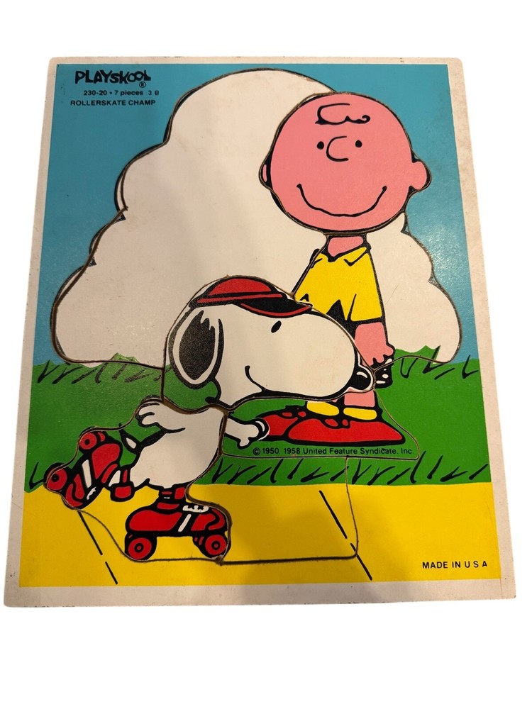 This 1958 Playskool puzzle features a Charles and Snoopy theme from the Peanuts Gang. The 7-piece wooden puzzle is brightly colored and suitable for children aged 1-4 years. It depicts a scene of Roller Skate Champ, making it an engaging and fun educational toy for young children.