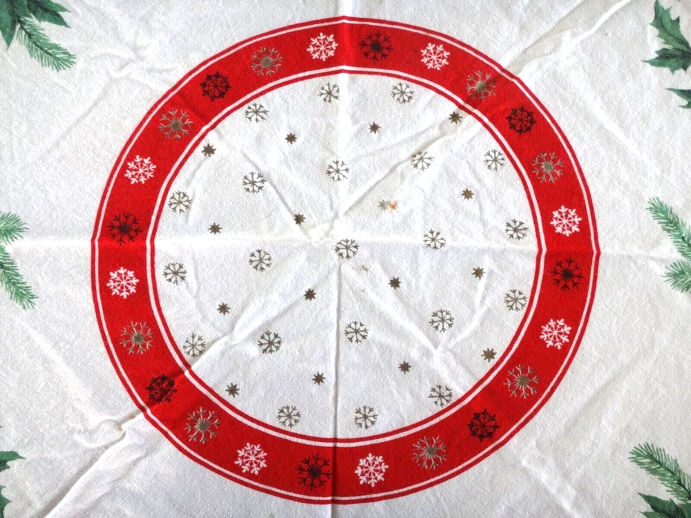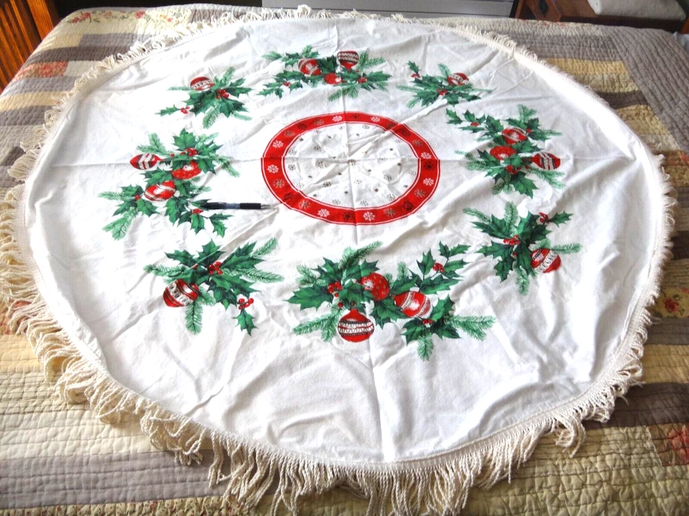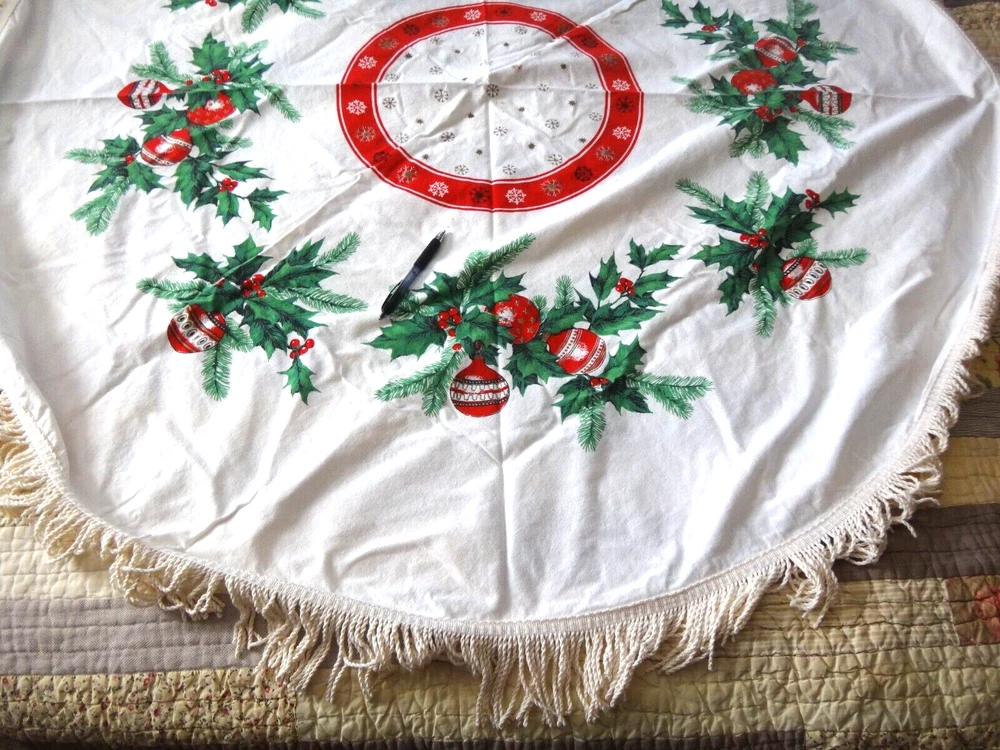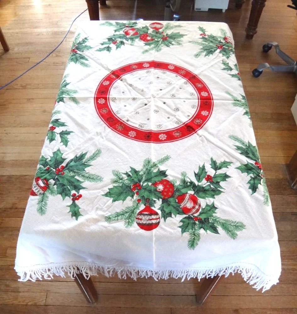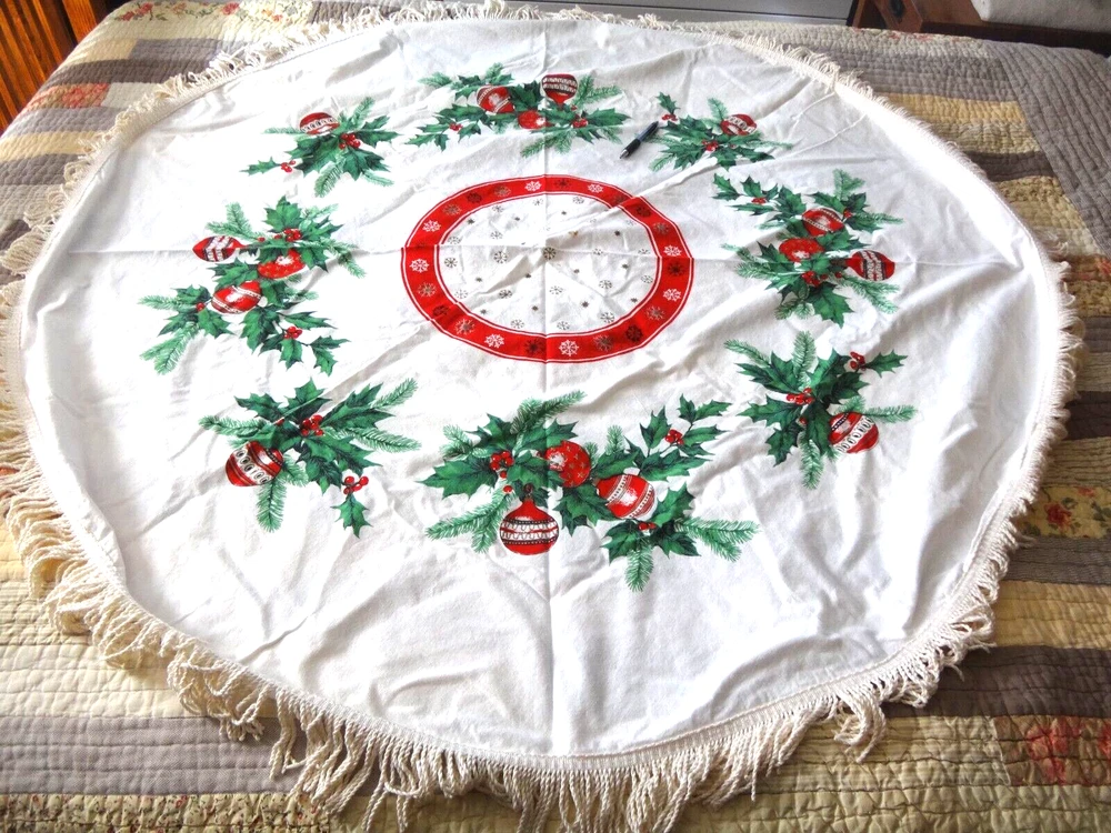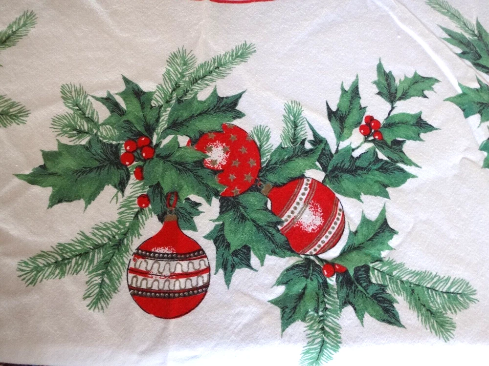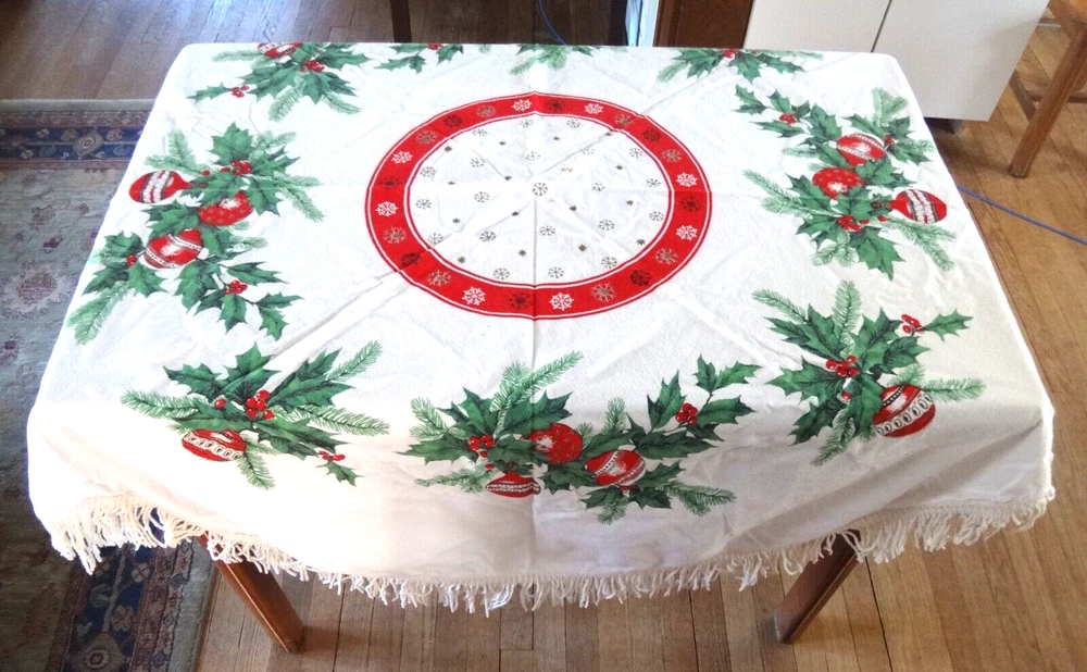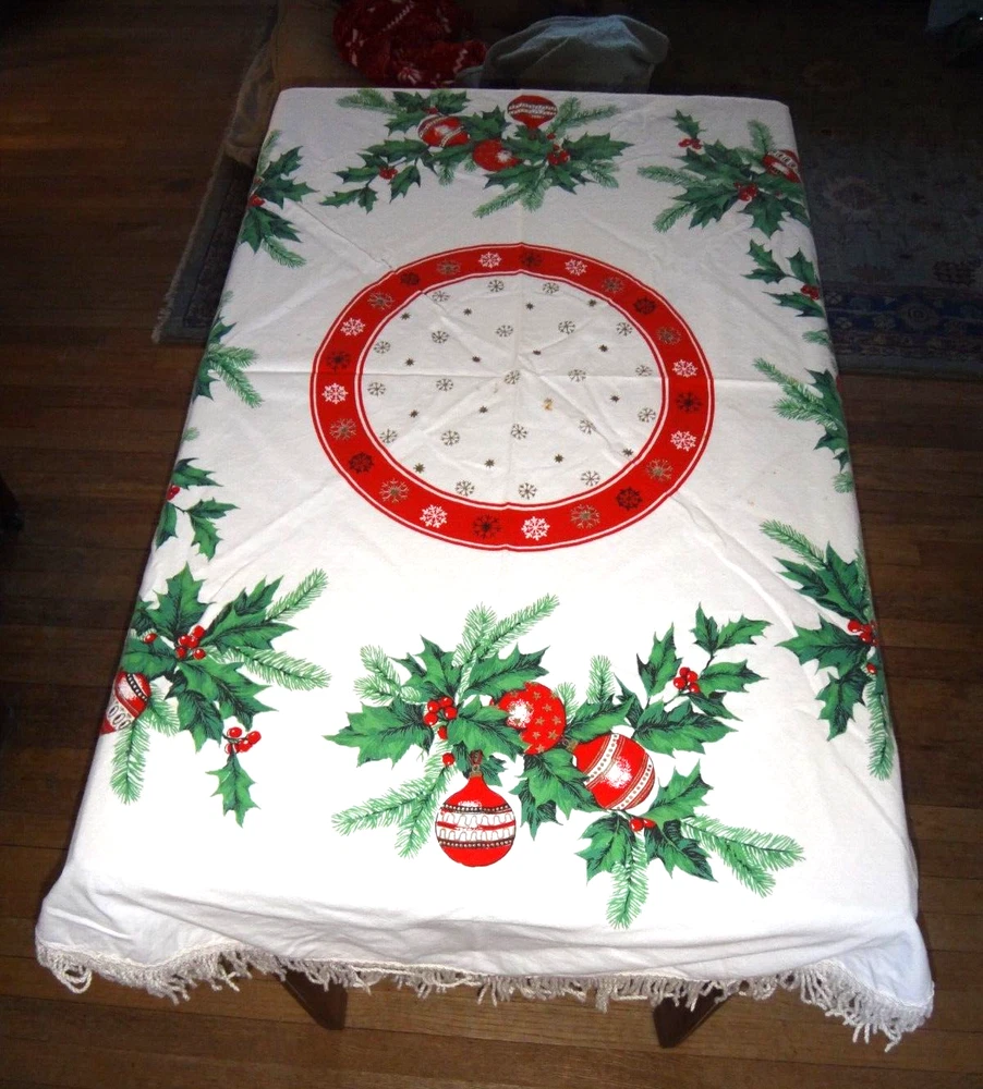 ALL my items come from a SMOKE FREE home! You found my item because you're obviously looking for one and I have GOOD NEWS for you: I am on ebay PRICED TO SELL and NOT to display! My LOW LOW Buy It Now price is LESS than what other IDENTICAL or COMPARABLE items have SOLD for on ebay in the last 90 days! Want to try for an even BETTER deal? Shoot me your best offer; the worst that can happen is I decline and counteroffer, but IF YOUR OFFER IS REALISTIC AND NOT INSULTINGLY LOW my auctions are set to automatically accept "REASONABLE" offers so you might be INSTANTLY surprised! Check out my other auctions because I combine auctions to save you postage! Please note shipping costs are out of my control! I do my ABSOLUTE BEST to pack in a box which will measure and weigh the least while providing the best protection against damage in shipping. ALL carriers have increased postage costs, USPS postage is the default shipping method which in some cases will be more expensive than FedEx or UPS. The shipping estimator IS NOT ALWAYS CORRECT, so IF the postage seems high, PLEASE use the "Ask Seller a Question" button and provide your Zip Code so I can get you ACTUAL POSTAGE costs. I am happy to email you FULL-SCREEN, HIGH-RESOLUTION, pictures of all sides but you will need to provide an email address I can send them to. Conveniently located in WYCKOFF, NJ 07481, I am just 20 short miles WEST of MANHATTAN, NYC, NEW YORK CITY, and welcome local pick-ups, but I also ship WORLDWIDE! Although DRACONIAN eBay regulations prevent me from OFFERING to accept anything other than PayPal, it is YOUR RIGHT AS A BIDDER to ask me if you can pay otherwise because I offer a DISCOUNT for other types of payments! 1950's VINTAGE MCM Christmas Cotton Tablecloth with Green Holly Leaves and Pine Needles, Red, White and Gold Christmas Ball Ornaments and Snowflakes Measures 55" Round (plus 3" long fringes) I don't have a round table to use it on: The photo of it spread out was taken on a queen size bed. The table it is covering measures 25" x 40" Would also make a great Christmas Tree Skirt because the design allows a hole to be put in the center. Excellent Vintage Used Condition. I can't find any signs of use but there are a few very small spots which appear to be from storage because they line up when folded. I have NOT tried to clean it so they may come out with a professional cleaning. Pen points to them so you can see their location on the entire piece. Pix of it on the table are NOT duplicates: they show it from ALL 4 sides. Please refer to pix to determine condition.