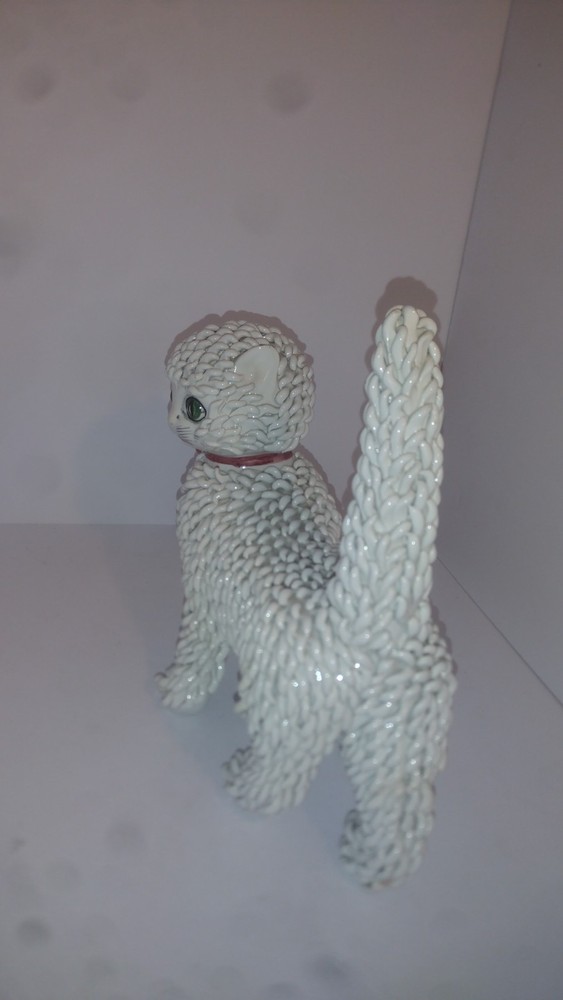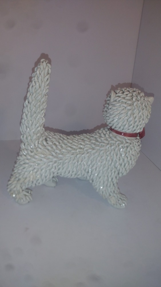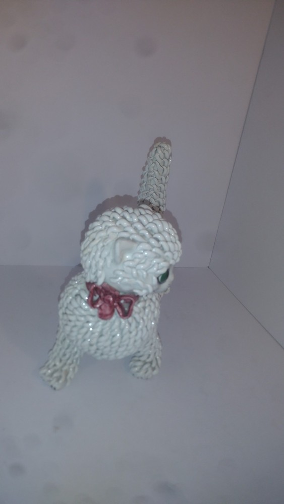 The product is a 1950s Italian white ceramic cat figurine with green eyes and a red bowl. This collectible piece captures the essence of a playful "spaghetti" cat from the mid-20th century, adding a touch of charm and nostalgia to any collection of cat-themed figurines. The unique combination of colors and design elements make this figurine a standout piece for cat lovers and collectors alike.