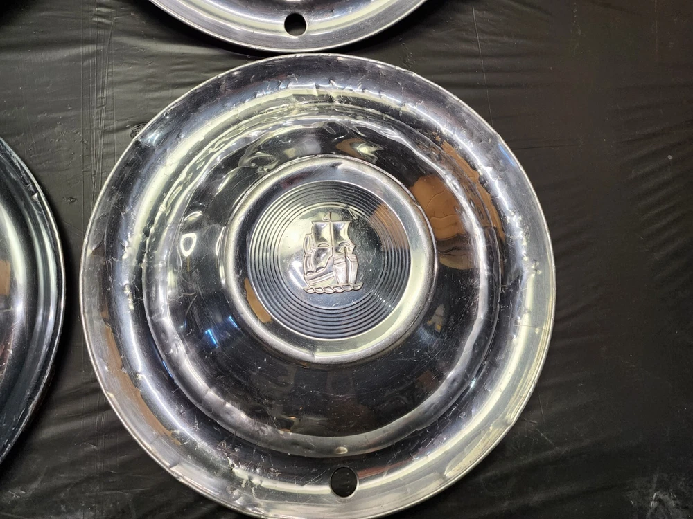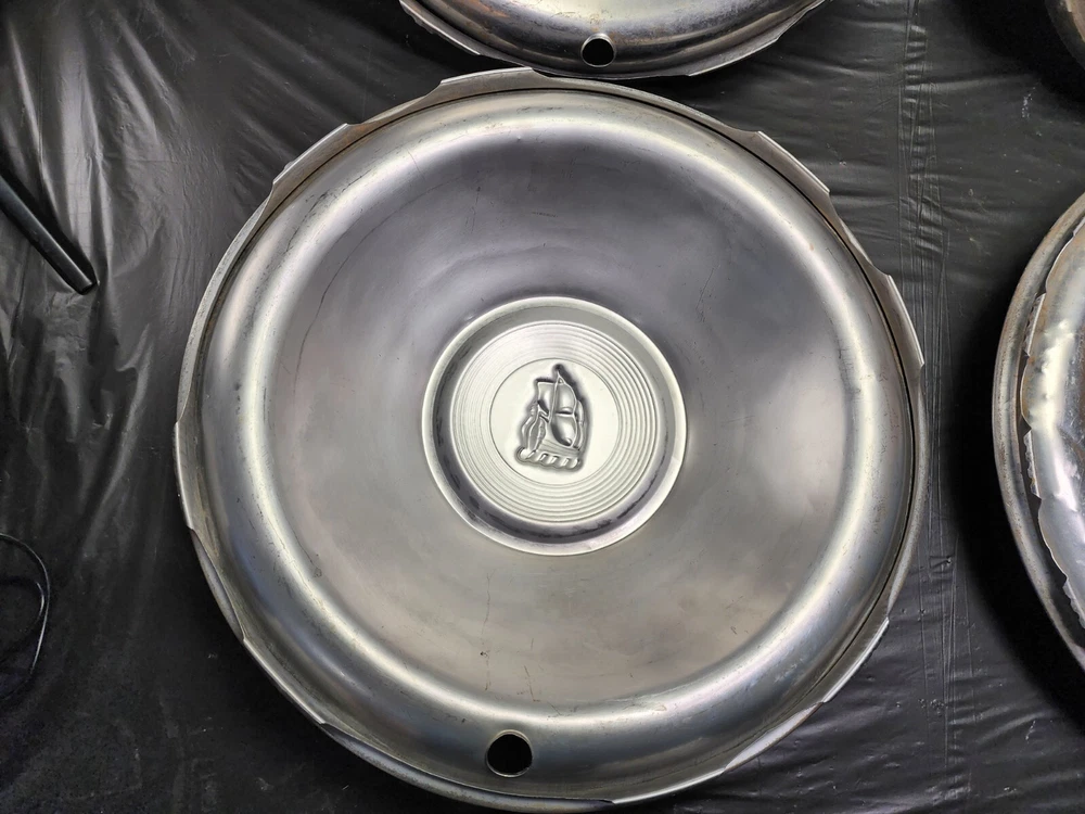 Vintage 50s 60s 70s hub caps. 1951 Plymouth Mopar set of 4 Original OEM OE hubcaps. not in the best of shape, pretty roughed up from decades of use and being on the road. would be decent for a ratrod or wall hangers. These are Used hubcaps off of old classic cars that were driven on the roadand used, so please see photos for complete condition as they are not all perfect. Most have some fading, dings, scuffing, mineral staining, etc could use a good polishing to bring em back to full shine, but otherwise in beautiful condition. Check out more of my ebay page as we are going through and listing a ton of classic / vintage hubcaps from the the 20's 30's 40's 50's 60's 70's 80's 90's 00's and up. all different makes and models such as Ford Chevy Chevrolet GM Cadillac GMC camero nova Chevelle Nomad Bel Air Mercury Corvette Mustang Oldsmobile Pontiac Lincoln Dodge Plymouth Buick Chrysler Mopar Fairlane Volkswagen Cheiftain Challanger Charger 1500 4x4 muscle car hot rod rat rod Cars and Trucks 15in 14in 16in and so much more from full sets to sets of 2 and singles, you name it check us out!