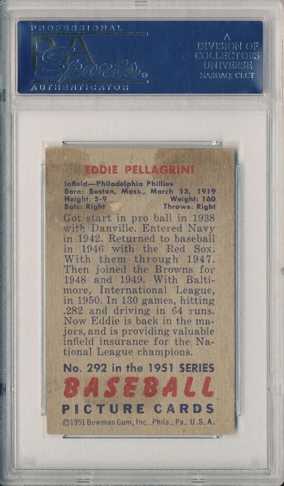 Authenticator Pre-Certified Authenticator: PSA/DNA Item's unique digital ID: 17645074 History of item: Eddie Pellagrini Signed original 1951 Bowman card encapsulated by PSA/DNA. Describe how you came to possess this item: Purchased in large collection. This listing is for the rare 1951 Bowman Eddie Pellagrini (d.2006) autographed card #292 authenticated and encapsulated by PSA /DNA pictured above. The short printed high number series card itself is in decent condition with some front/back surface wear and it features a nice vintage ballpoint ink autograph from the Phillies star ! The classic 1 951 Bowman cards are a highly desirable vintage card set, and this one features a great example of the baseball great's signature. This signature is encapsulated by PSA/DNA with authentication #17645074. This may be verified on the PSA website by entering the number from the PSA/DNA authentication to get confirmation of the specific signed item. This card has been encapsulated using PSA's more expensive red flip service which not only authenticates the signature, but also authenticates that this indeed is a vintage, not a counterfeit or reprint, 1951 Bowman card which has not been trimmed or altered. Domestic shipping will be free. International bidders please email us for a shipping quote. We do accept eBay payments. If you are an international bidder, we may require that you pay for Global Priority Mail so a tracking number may be provided for your item. Please take a look at our other items available for sale. If you have any questions at all, please do not hesitate to ask them.