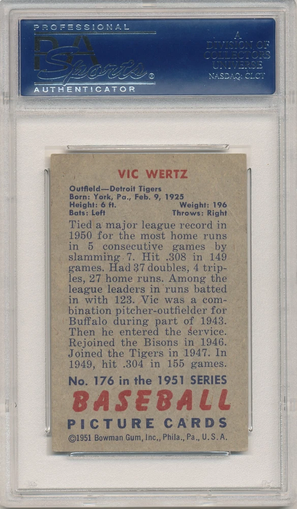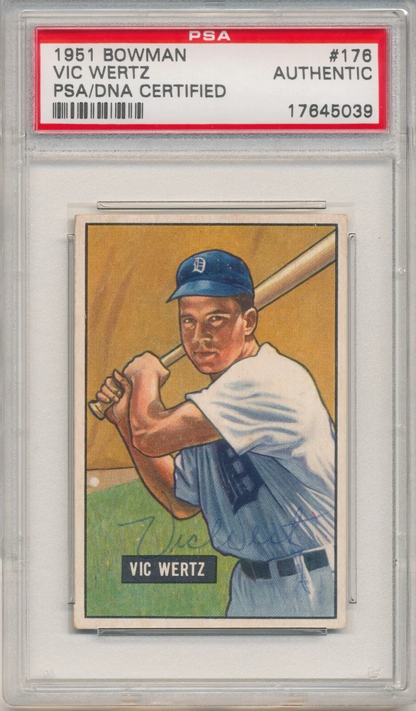 Authenticator Pre-Certified Authenticator: PSA/DNA Item's unique digital ID: 17645039 History of item: Vic Wertz Signed original 1951 Bowman card encapsulated by PSA/DNA. Describe how you came to possess this item: Purchased in large collection. This listing is for the rare 1951 Bowman Vic Wertz (d.1983) autographed card #176 authenticated and encapsulated by PSA /DNA pictured above. The card itself is in decent condition and it features a nice vintage ballpoint ink autograph from the Tigers star ! The classic 1 951 Bowman cards are a highly desirable vintage card set, and this one features a great example of the baseball great's signature. This signature is encapsulated by PSA/DNA with authentication #17645039. This may be verified on the PSA website by entering the number from the PSA/DNA authentication to get confirmation of the specific signed item. This card has been encapsulated using PSA's more expensive red flip service which not only authenticates the signature, but also authenticates that this indeed is a vintage, not a counterfeit or reprint, 1951 Bowman card which has not been trimmed or altered. Domestic shipping will be free. International bidders please email us for a shipping quote. We do accept eBay payments. If you are an international bidder, we may require that you pay for Global Priority Mail so a tracking number may be provided for your item. Please take a look at our other items available for sale. If you have any questions at all, please do not hesitate to ask them.