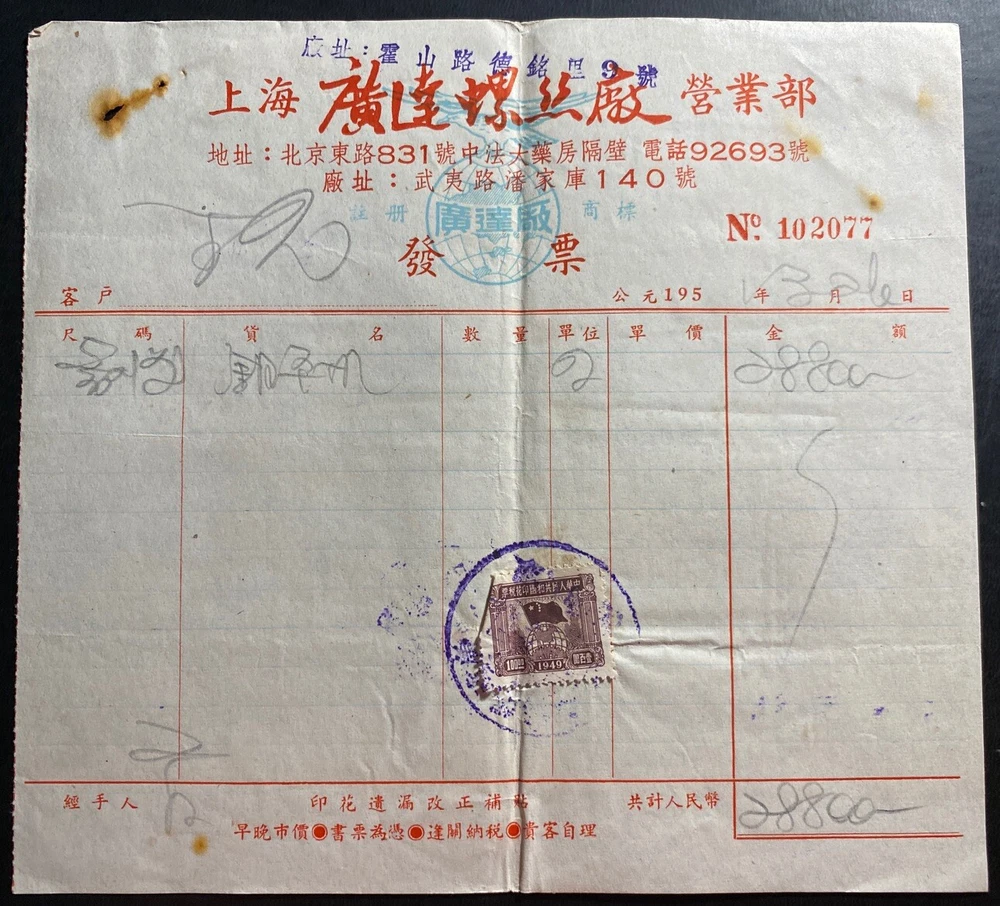 Up for auction is a beautiful revenue stamp receipt invoice red cover from China . Great markings and cancels. In Good condition. Priced to sell. Postmarked in Chinese dated in 1951. Nice postal History