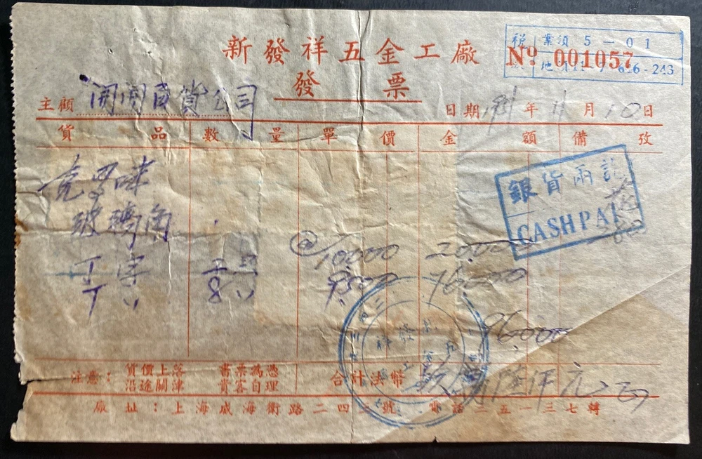 1951 China Revenue Stamps Receipt Invoice cover 1057