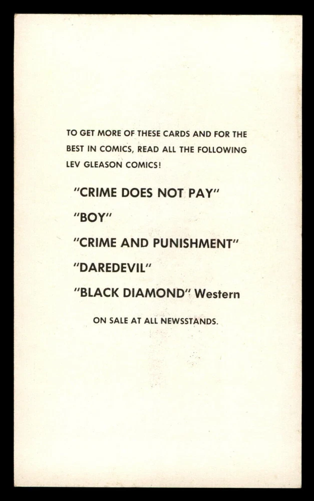 1951 Lev Gleason Comic Cards Coupon #7 Bumper (Black Diamond Western) NM Description Attached is a high resolution scan. Shipping Terms Upon receipt of payment, items will typically ship within 1-2 business days. If multiple items are purchased together, shipping will be automatically combined at checkout. FAQ - Cards that are graded VG/EX or lower may have wrinkles or creases. If you have a specific question regarding a card's condition, please ask. - In the title, you may see notations such as "*e1, *d2, etc", these do not refer to the card grade, but are internal inventory designators. About Us BBC Emporium is always aggressively buying sports cards from 1975 and older. We travel the entire country and always offer competitive pricing. Contact us for a quote on your collection.