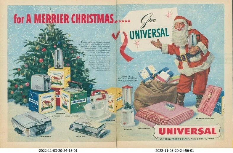 Ad from Look magazine- December 18, 1951. This ad is 2 full pages- the 1st image shows the 2 pages digitally placed side by side, and the other images show the individual pages. A full page is about 10 inches by 13 inches. Please see scan for image of page. All ads have been carefully removed and are original- no copies or reprints of any type. All ads are shipped in protective resealable bag which is placed in a cardboard no bend mailer. All ads are shipped USPS First Class- combined shipping available on ads. These advertisements are perfect for framing.