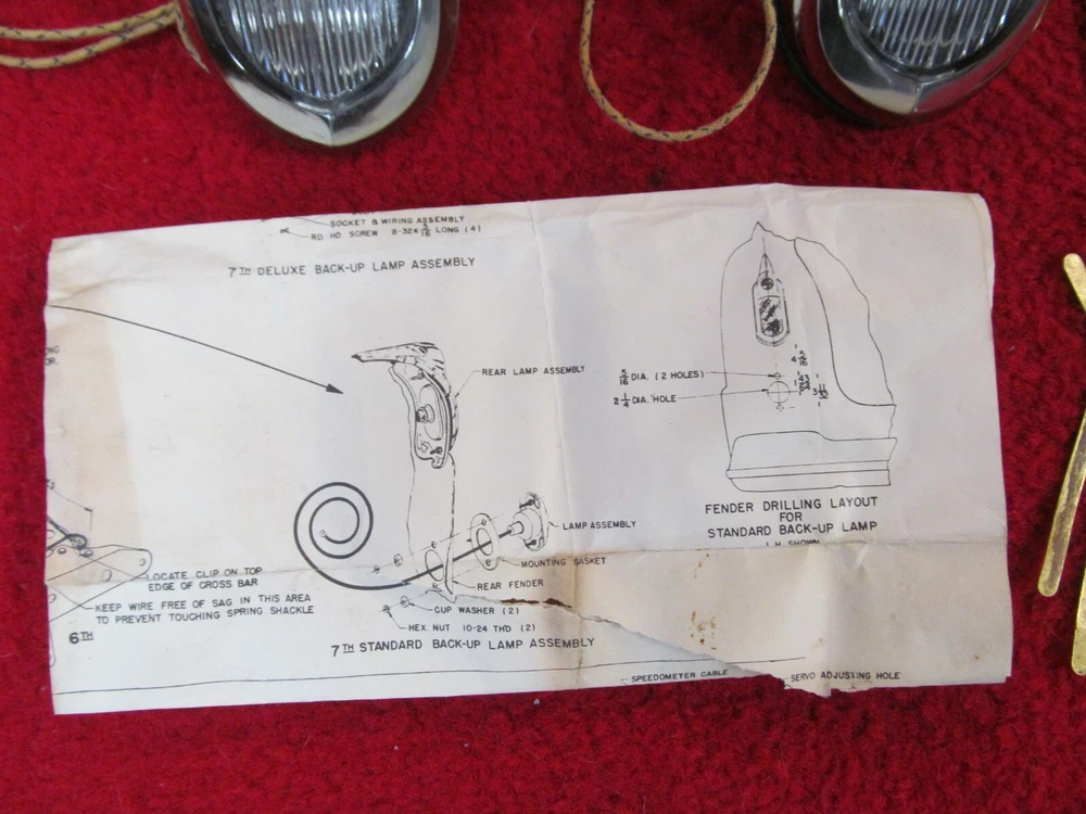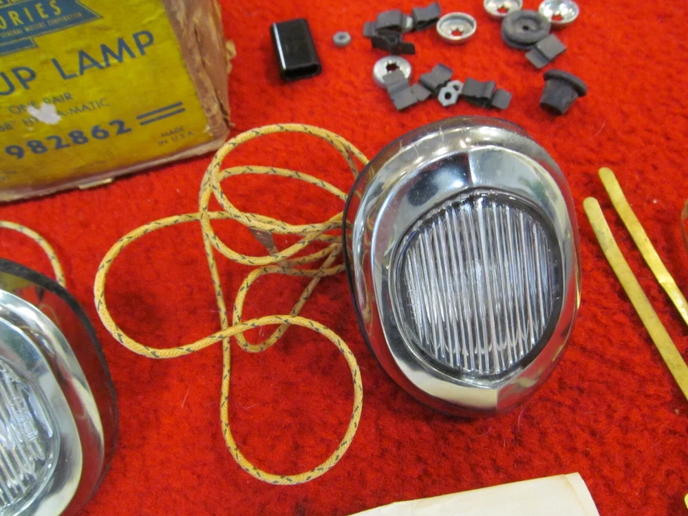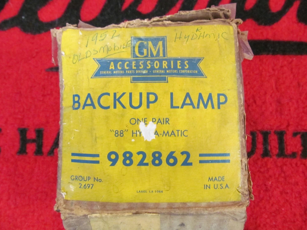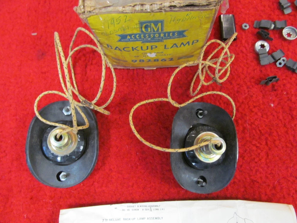 1952 Oldsmobile 88 NOS GM Accessory Backup Reverse Light Set. GM part # 982862. This is for cars that have a HT Automatic and did NOT come with back up lights. This NOS set looks incomplete-you get everything seen in pics. Gaskets are hard. Fusick Automotive Products