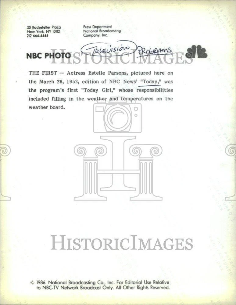 ebay template Note: Please study the images carefully to determine the condition of this vintage photograph, as it may not be in perfect condition. It may contain wrinkles, cracks, and possibly even tears due to its age and how it was handled before it got to us. A scanner may interpret colors and contrast differently than human eyes will, so it is possible that the actual photograph may be slightly darker or lighter in person. This vintage photograph is offered for sale as a collectible item and conveys no transfer of copyright. 1952 Press Photo TV Program Estelle Parsons Actress NBC - RRR75905 Photo measures 7 x 9 in. Actress Estelle Parsons, edition of NBC news today was the program's first "Today Girl". PHOTO FRONT PHOTO BACK Historic Images Part Number: RRR75905 Sell Smarter with Kyozou. Inventory and Ecommerce Management
