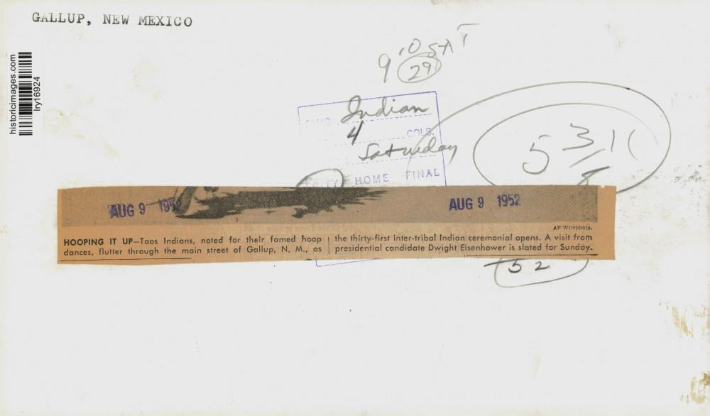 ebay template Note: Please study the images carefully to determine the condition of this vintage photograph, as it may not be in perfect condition. It may contain wrinkles, cracks, and possibly even tears due to its age and how it was handled before it got to us. A scanner may interpret colors and contrast differently than human eyes will, so it is possible that the actual photograph may be slightly darker or lighter in person. This vintage photograph is offered for sale as a collectible item and conveys no transfer of copyright. 1952 Press Photo Taos Indians dance in a parade in Gallup, NM - lry16924 This is an original press photo. Hooping It Up - Taos Indians, noted for their famed hoop dances, flutter through the main street of Gallup, NM, as the thirty-first inter-tribal Indian ceremonial opens. A visit from Presidential candidate Dwight Eisenhower is slated for Saturday.Photo measures 10 x 5.75inches. Photo is dated 08-09-1952. PHOTO FRONT PHOTO BACK Historic Images Part Number: lry16924 FAQs Q: Can I just download a digital version instead? A: No, we sell only vintage originals and do not make or distribute any copies, including digital ones. Q: Do you combine shipping and invoices? A: Multiple photos won on the same seller ID combine automatically through the eBay checkout process. If you encounter problems with this, send us a message via eBay messaging and we will send you an invoice. Due to eBay limitations, we cannot combine items won on our different seller IDs for a single shipping charge. Q: How quickly do you ship the items once paid? A: We ship within one business day after your payment clears. If you do not receive an "order shipped" email from us by the close of the second business day from submitting payment, please e-mail us via eBay messaging. Q: How do you make sure my photograph arrives safely? A: We package each order between two cross-corrugated pieces of cardboard to ensure that the package is as difficult to bend as possible. We then wrap each order in a plastic sheet to help protect against moisture. We want you to rest assured that we take every precaution to ensure that the photograph you receive will be in the same condition in your care as it was in ours. Q: Will the "Historic Images" watermark be on my photo when I receive it? A: No. This is a digital watermark we use to protect our images. It is not printed on the photo. Q: What are your office hours? A: eBay for us is a business, and a very fun one to be in! We are open M-F 9 to 5 (CST). Therefore, we do not return e-mails and phone calls over the weekend. We observe the following holidays: New Years Day, Memorial Day, Fourth of July, Labor Day, Thanksgiving and the day after Thanksgiving, Christmas Eve and Christmas Day. Q: Where did all these vintage photos come from? A: These original vintage photographs are from various news service and newspaper photo archives from locations around the country including: Boston, Detroit, Tampa, Chicago, Denver, Seattle, New Orleans, Milwaukee, Portland, Spokane, and more. We do not copy or reproduce any photographs -- every item is a unique vintage piece that was housed in a news archive. Q: Can I use this photograph in my book/blog/website? A: The short answer is no. There is no transfer of copyright for republication or reproduction with these photographs when you purchase them, and only photographs taken before 1923 are currently automatically in the public domain. Permission from the copyright holder, which usually can be identified from the back of each photo, must be sought to republish or reproduce the image for any purpose. Q: Do you relist items (in case I miss an auction ending)? A: Auction items that receive no bids are relisted in our store (historicimages-store on eBay) as a fixed-price item and at a higher price than the starting auction price. Q: Do you leave feedback? A: Yes, we always leave feedback for buyers. Our software monitors when our buyers leave us feedback, then notifies us that we can leave feedback for the buyer. Rest assured, if you leave feedback, we will do the same! Check out our family of eBay IDs: historicimages01 Sports Photos historicimages02 Entertainment Photos historicimages03 Americana Photos historicimages04 International & War Photos historicimages05 Transportation Photos historicimages06 Photos of All Subjects historicimages07 Entertainment Photos historicimages08 Newsworthy Photos historicimages09 Entertainment Photos historicimages10 Sports Photos historicimages-store Our largest fixed-price selection historicimages-gallery Hand-picked photos Saturday night auctions About Us Historic Images was formed in September 2009, with a handful of scanners working out of a basement to digitize newspaper photo archives. We have since moved out of the basement, and we can now archive thousands of photos per day. Our company has worked with magazines and newspapers from Detroit, Boston, Denver, Seattle, Tampa, Chicago, and New Orleans, just to name a few. We are constantly adding to our inventory, and have assembled an archive of millions of photos to date. As our company evolved, we began our eBay business, which brings thousands of fresh auctions per week to the world's largest online auction marketplace. Our custom software systems and team of great employees allow us to efficiently scan and sell large photo archives online. At the very core of our company's DNA is a strong commitment to customer satisfaction and strict integrity for our product. Our promise to you is that we will do everything in our power to provide you a great buying experience. Copyright 2009 - Present, Historic Images, Inc. Sell Smarter with Kyozou. Inventory and Ecommerce Management