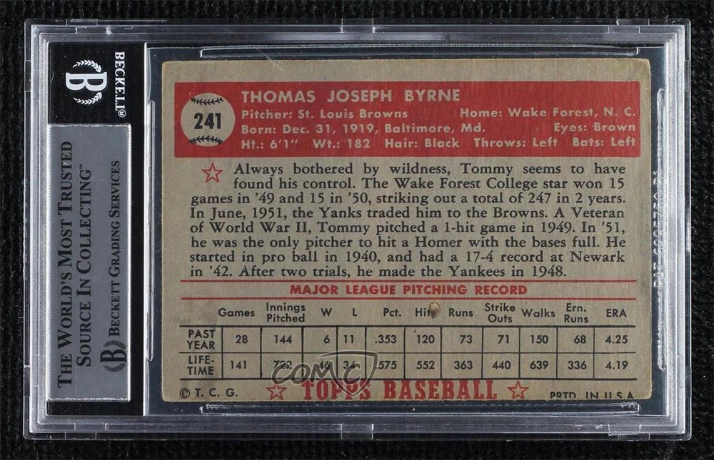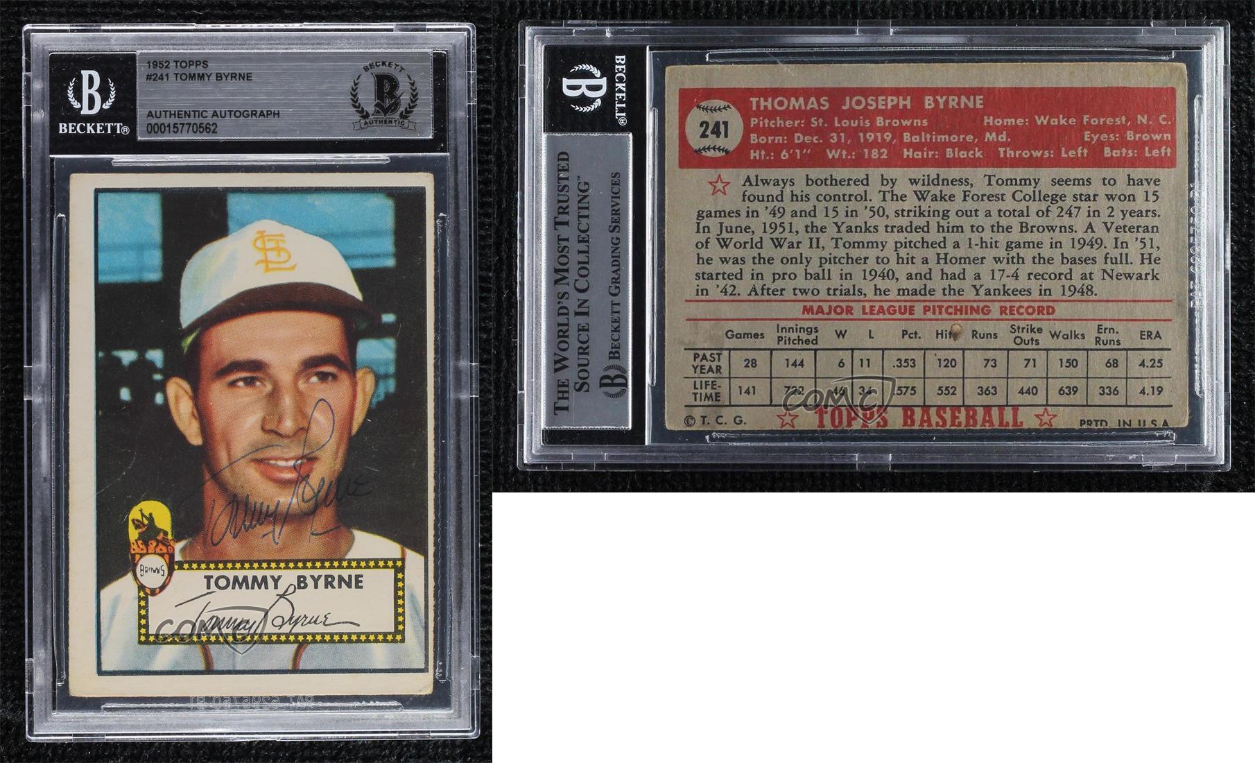 Type: Sports Trading Card Card Manufacturer: Topps Year Manufactured: 1952 Graded: No Team: St. Louis Browns Original/Reprint: Original Season: 1952 Year: 1952 Card Number: 241 Card Name: Tommy Byrne Grade: BGS Authentic Sport: Baseball Manufacturer: Topps Athlete: Tommy Byrne Player: Tommy Byrne Product: Single Parallel/Variety: [None] Player/Athlete: Tommy Byrne Professional Grader: BAS Franchise: N/A Set: 1952 Topps - [Base]