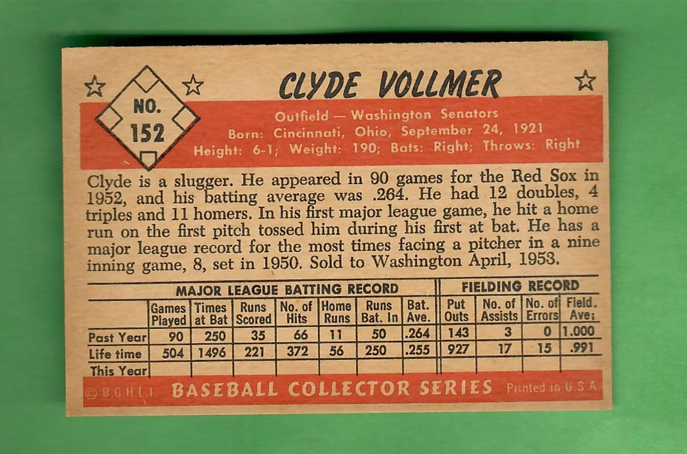 Player/Athlete: Clyde Vollmer Year Manufactured: 1953 Manufacturer: Bowman Card Number: 152 Card Manufacturer: BOWMAN Set: 1953 Bowman Color Season: 1953 Year: 1953 Original/Licensed Reprint: Original Card Size: Bowman UPC: Does not apply gtin13: Does not apply Sport: Baseball Team: Washington Senators