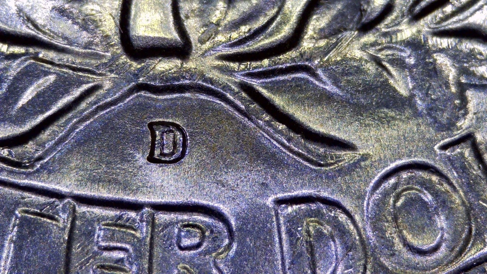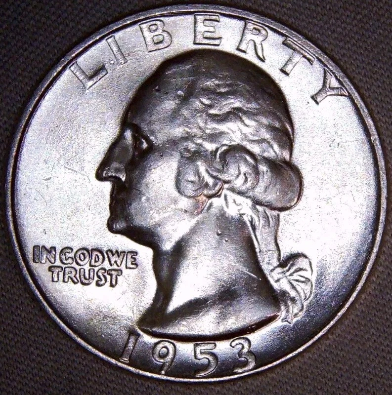 A 1953 Washington Quarter from the Denver mint, featuring a variety with the mint mark over a previous mint mark (OMM-001) and a repunched mint mark (FS-601). This uncirculated coin is composed of 90% silver and has a denomination of 25 cents.