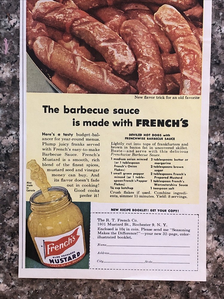 The product is a vintage magazine print ad from 1953 for French's Mustard featuring Deviled Hot Dogs made with Frenchwise Barbecue Sauce. The ad is multi-color and measures approximately 5"x12". It is an original advertisement created in the United States for French's brand.