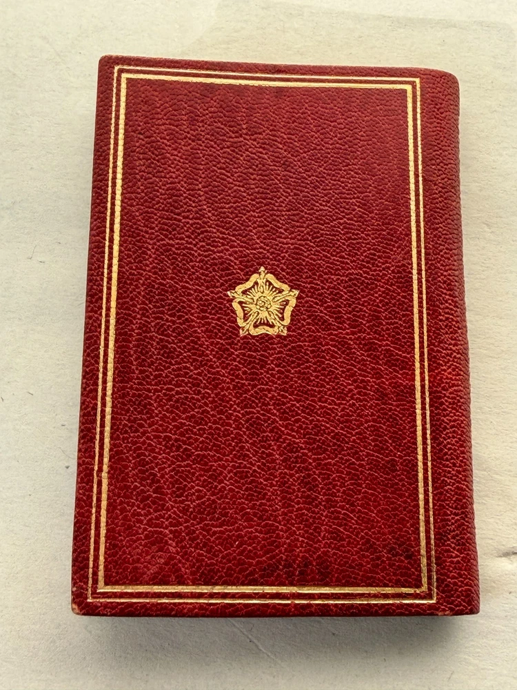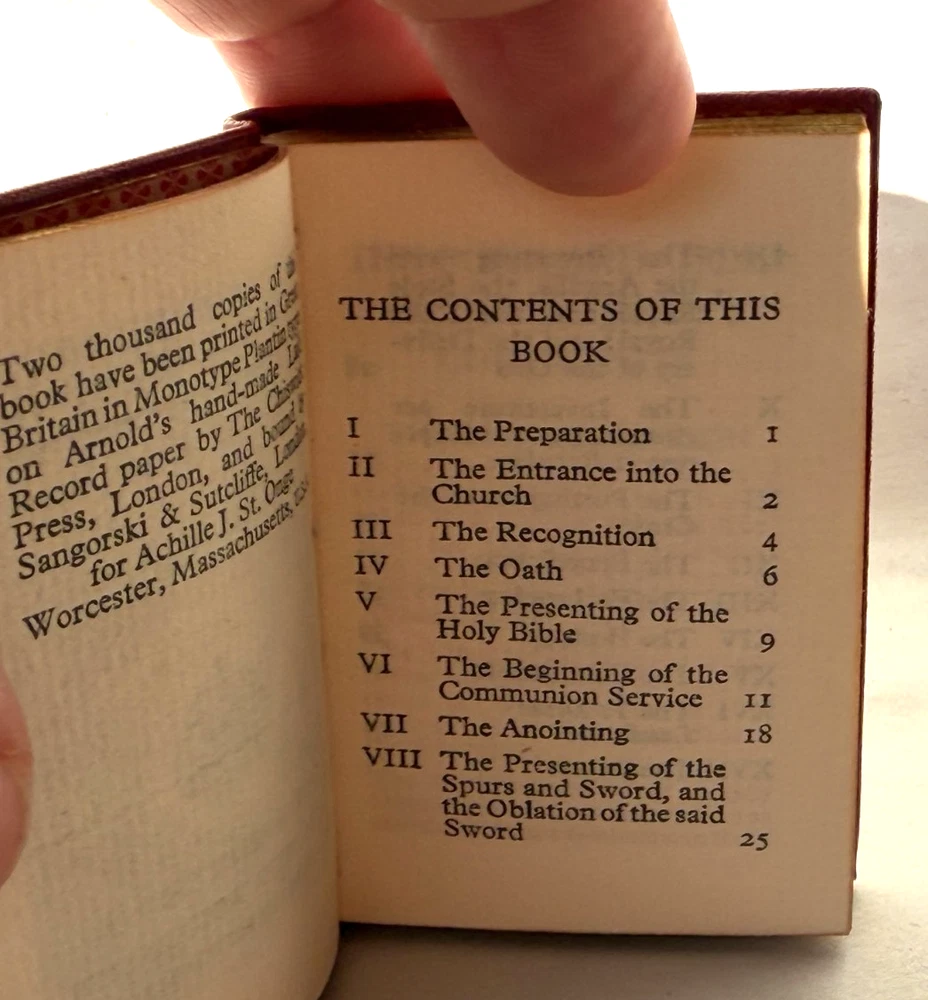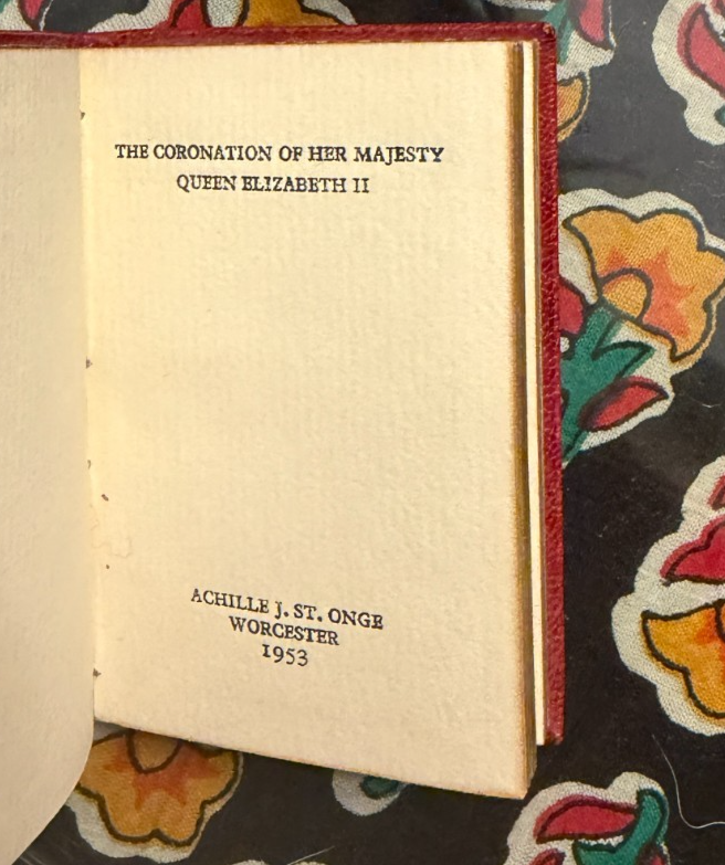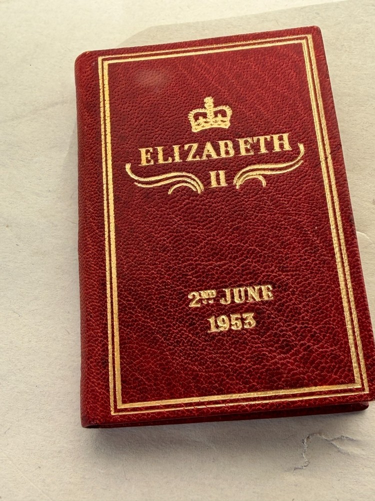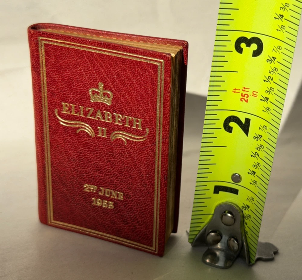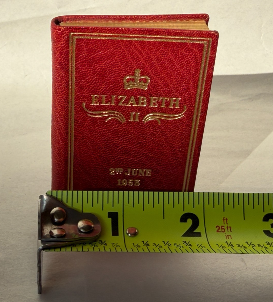 Miniature commemorative book issued for the Coronation of Her Majesty Queen Elizabeth II , dated 2nd June 1953 . Published by Achille J. St. Onge, Worcester, Massachusetts , a noted American miniature-book publisher. Contains the order of service for the coronation ceremony. A well-made collectible produced specifically for miniature-book collectors and royal memorabilia enthusiasts. A scarce and charming piece of Elizabeth II coronation ephemera and a desirable example of mid-century American miniature bookmaking. Details: Format: Miniature book (portrait orientation) Size: approx. 2.75″ x 1.75″ Binding: Gilt-lettered red leather with all-edge gilt (AEG) Pages: 77 pages, printed in black and red Edition: Limited to 2,000 copies Year: 1953 Condition: Covers show slight darkening and age-appropriate wear; pages toned with age. Structurally sound and complete. See photos for exact condition. 📬 Shipping: Securely packed for miniature books and shipped via USPS Ground Advantage . Combined shipping available. 👉 Thanks for visiting! Explore my shop for estate-found miniature books and historical ephemera. 👈
