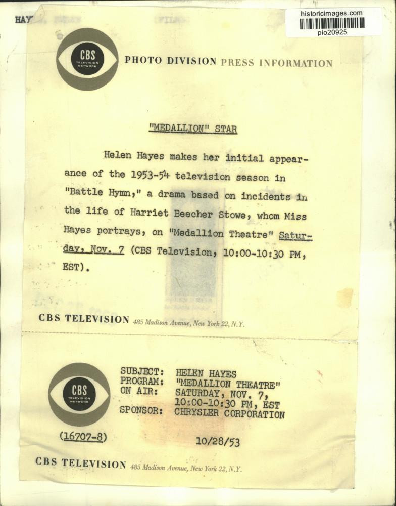 ebay template Note: Please study the images carefully to determine the condition of this vintage photograph, as it may not be in perfect condition. It may contain wrinkles, cracks, and possibly even tears due to its age and how it was handled before it got to us. A scanner may interpret colors and contrast differently than human eyes will, so it is possible that the actual photograph may be slightly darker or lighter in person. This vintage photograph is offered for sale as a collectible item and conveys no transfer of copyright. 1953 Press Photo Actress Helen Hayes stars in "Medallion Theater: Battle Hymn" This is an original press photo. Helen Hayes makes her initial appearance of the 1953-54 television season in "Battle Hymn," a drama based on incidents in the life of Harriet Beecher Stowe, whom Miss Hayes portrays, on "Medallion Theater" Saturday, November 7 (Columbia Broadcasting System-Television, 10:00-10:30 PM, EST). Photo measures 7.25 x 9.25inches. Photo is dated 10-28-1953. PHOTO FRONT PHOTO BACK Historic Images Part Number: pio20925 FAQs Q: Can I just download a digital version instead? A: No, we sell only vintage originals and do not make or distribute any copies, including digital ones. Q: Do you combine shipping and invoices? A: Multiple photos won on the same seller ID combine automatically through the eBay checkout process. If you encounter problems with this, send us a message via eBay messaging and we will send you an invoice. Due to eBay limitations, we cannot combine items won on our different seller IDs for a single shipping charge. Q: How quickly do you ship the items once paid? A: We ship within one business day after your payment clears. If you do not receive an "order shipped" email from us by the close of the second business day from submitting payment, please e-mail us via eBay messaging. Q: How do you make sure my photograph arrives safely? A: We package each order between two cross-corrugated pieces of cardboard to ensure that the package is as difficult to bend as possible. We then wrap each order in a plastic sheet to help protect against moisture. We want you to rest assured that we take every precaution to ensure that the photograph you receive will be in the same condition in your care as it was in ours. Q: Will the "Historic Images" watermark be on my photo when I receive it? A: No. This is a digital watermark we use to protect our images. It is not printed on the photo. Q: What are your office hours? A: eBay for us is a business, and a very fun one to be in! We are open M-F 9 to 5 (CST). Therefore, we do not return e-mails and phone calls over the weekend. We observe the following holidays: New Years Day, Memorial Day, Fourth of July, Labor Day, Thanksgiving and the day after Thanksgiving, Christmas Eve and Christmas Day. Q: Where did all these vintage photos come from? A: These original vintage photographs are from various news service and newspaper photo archives from locations around the country including: Boston, Detroit, Tampa, Chicago, Denver, Seattle, New Orleans, Milwaukee, Portland, Spokane, and more. We do not copy or reproduce any photographs -- every item is a unique vintage piece that was housed in a news archive. Q: Can I use this photograph in my book/blog/website? A: The short answer is no. There is no transfer of copyright for republication or reproduction with these photographs when you purchase them, and only photographs taken before 1923 are currently automatically in the public domain. Permission from the copyright holder, which usually can be identified from the back of each photo, must be sought to republish or reproduce the image for any purpose. Q: Do you relist items (in case I miss an auction ending)? A: Auction items that receive no bids are relisted in our store (historicimages-store on eBay) as a fixed-price item and at a higher price than the starting auction price. Q: Do you leave feedback? A: Yes, we always leave feedback for buyers. Our software monitors when our buyers leave us feedback, then notifies us that we can leave feedback for the buyer. Rest assured, if you leave feedback, we will do the same! Check out our family of eBay IDs: historicimages01 Sports Photos historicimages02 Entertainment Photos historicimages03 Americana Photos historicimages04 International & War Photos historicimages05 Transportation Photos historicimages06 Photos of All Subjects historicimages07 Entertainment Photos historicimages08 Newsworthy Photos historicimages09 Entertainment Photos historicimages10 Sports Photos historicimages-store Our largest fixed-price selection historicimages-gallery Hand-picked photos Saturday night auctions About Us Historic Images was formed in September 2009, with a handful of scanners working out of a basement to digitize newspaper photo archives. We have since moved out of the basement, and we can now archive thousands of photos per day. Our company has worked with magazines and newspapers from Detroit, Boston, Denver, Seattle, Tampa, Chicago, and New Orleans, just to name a few. We are constantly adding to our inventory, and have assembled an archive of millions of photos to date. As our company evolved, we began our eBay business, which brings thousands of fresh auctions per week to the world's largest online auction marketplace. Our custom software systems and team of great employees allow us to efficiently scan and sell large photo archives online. At the very core of our company's DNA is a strong commitment to customer satisfaction and strict integrity for our product. Our promise to you is that we will do everything in our power to provide you a great buying experience. Copyright 2009 - Present, Historic Images, Inc. Sell Smarter with Kyozou. Inventory and Ecommerce Management