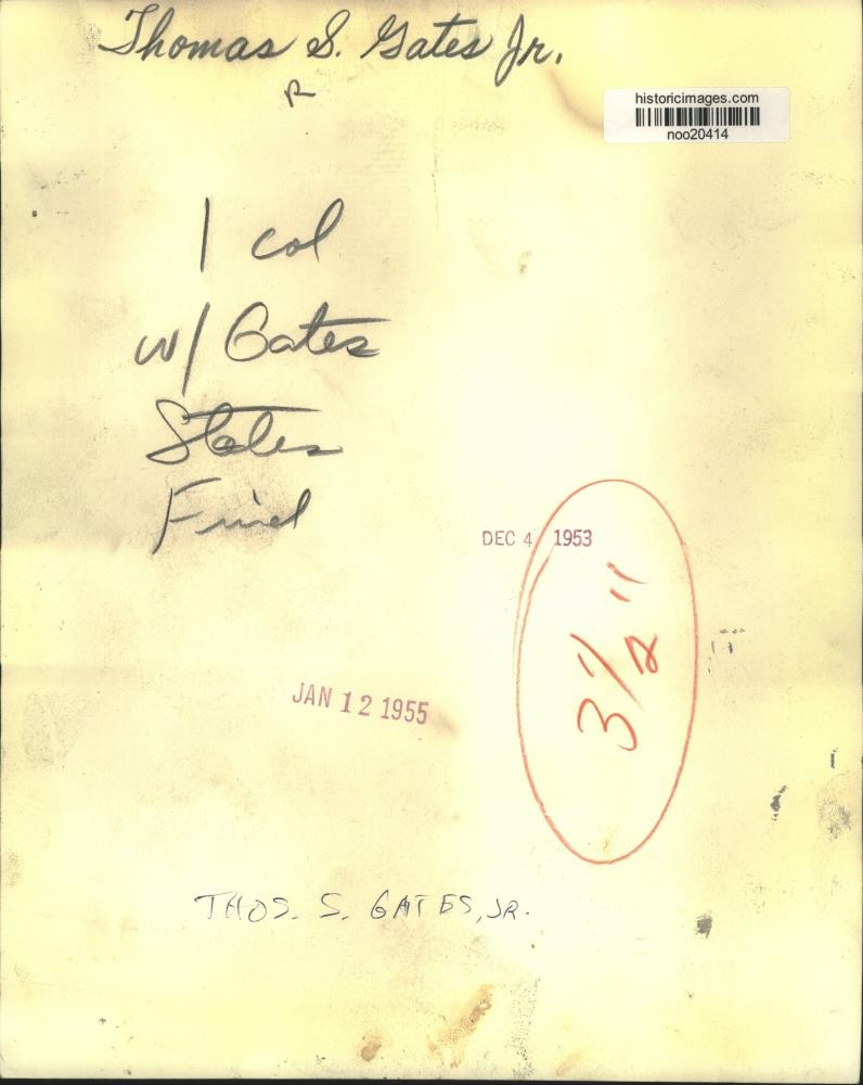 ebay template Note: Please study the images carefully to determine the condition of this vintage photograph, as it may not be in perfect condition. It may contain wrinkles, cracks, and possibly even tears due to its age and how it was handled before it got to us. A scanner may interpret colors and contrast differently than human eyes will, so it is possible that the actual photograph may be slightly darker or lighter in person. This vintage photograph is offered for sale as a collectible item and conveys no transfer of copyright. 1953 Press Photo Undersecretary of the Navy Thomas S. Gates Jr. - noo20414 This is an original press photo. Thomas S. Gates Jr. Photo measures 8 x 10.25 inches. Photo is dated 12-04-1953. PHOTO FRONT PHOTO BACK Historic Images Part Number: noo20414 FAQs Q: Can I just download a digital version instead? A: No, we sell only vintage originals and do not make or distribute any copies, including digital ones. Q: Do you combine shipping and invoices? A: Multiple photos won on the same seller ID combine automatically through the eBay checkout process. If you encounter problems with this, send us a message via eBay messaging and we will send you an invoice. Due to eBay limitations, we cannot combine items won on our different seller IDs for a single shipping charge. Q: How quickly do you ship the items once paid? A: We ship within one business day after your payment clears. If you do not receive an "order shipped" email from us by the close of the second business day from submitting payment, please e-mail us via eBay messaging. Q: How do you make sure my photograph arrives safely? A: We package each order between two cross-corrugated pieces of cardboard to ensure that the package is as difficult to bend as possible. We then wrap each order in a plastic sheet to help protect against moisture. We want you to rest assured that we take every precaution to ensure that the photograph you receive will be in the same condition in your care as it was in ours. Q: Will the "Historic Images" watermark be on my photo when I receive it? A: No. This is a digital watermark we use to protect our images. It is not printed on the photo. Q: What are your office hours? A: eBay for us is a business, and a very fun one to be in! We are open M-F 9 to 5 (CST). Therefore, we do not return e-mails and phone calls over the weekend. We observe the following holidays: New Years Day, Memorial Day, Fourth of July, Labor Day, Thanksgiving and the day after Thanksgiving, Christmas Eve and Christmas Day. Q: Where did all these vintage photos come from? A: These original vintage photographs are from various news service and newspaper photo archives from locations around the country including: Boston, Detroit, Tampa, Chicago, Denver, Seattle, New Orleans, Milwaukee, Portland, Spokane, and more. We do not copy or reproduce any photographs -- every item is a unique vintage piece that was housed in a news archive. Q: Can I use this photograph in my book/blog/website? A: The short answer is no. There is no transfer of copyright for republication or reproduction with these photographs when you purchase them, and only photographs taken before 1923 are currently automatically in the public domain. Permission from the copyright holder, which usually can be identified from the back of each photo, must be sought to republish or reproduce the image for any purpose. Q: Do you relist items (in case I miss an auction ending)? A: Auction items that receive no bids are relisted in our store (historicimages-store on eBay) as a fixed-price item and at a higher price than the starting auction price. Q: Do you leave feedback? A: Yes, we always leave feedback for buyers. Our software monitors when our buyers leave us feedback, then notifies us that we can leave feedback for the buyer. Rest assured, if you leave feedback, we will do the same! Check out our family of eBay IDs: historicimages01 Sports Photos historicimages02 Entertainment Photos historicimages03 Americana Photos historicimages04 International & War Photos historicimages05 Transportation Photos historicimages06 Photos of All Subjects historicimages07 Entertainment Photos historicimages08 Newsworthy Photos historicimages09 Entertainment Photos historicimages10 Sports Photos historicimages-store Our largest fixed-price selection historicimages-gallery Hand-picked photos Saturday night auctions About Us Historic Images was formed in September 2009, with a handful of scanners working out of a basement to digitize newspaper photo archives. We have since moved out of the basement, and we can now archive thousands of photos per day. Our company has worked with magazines and newspapers from Detroit, Boston, Denver, Seattle, Tampa, Chicago, and New Orleans, just to name a few. We are constantly adding to our inventory, and have assembled an archive of millions of photos to date. As our company evolved, we began our eBay business, which brings thousands of fresh auctions per week to the world's largest online auction marketplace. Our custom software systems and team of great employees allow us to efficiently scan and sell large photo archives online. At the very core of our company's DNA is a strong commitment to customer satisfaction and strict integrity for our product. Our promise to you is that we will do everything in our power to provide you a great buying experience. Copyright 2009 - Present, Historic Images, Inc. Sell Smarter with Kyozou. Inventory and Ecommerce Management